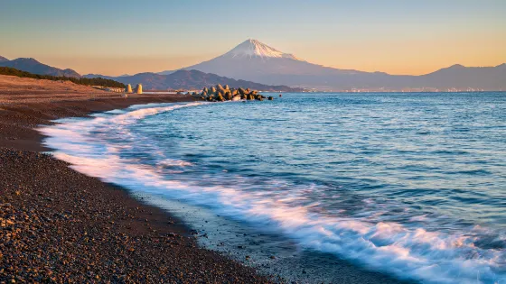 則評價三保之松原是位於清水港至駿河灣的突出的半島,在很久以前的平安時代,就是有名的景勝地。在三保之松原7公里長的海岸線上生長了5萬4000株松樹,是3代松原之一。仰望靈峰富士山,綠色的松林,白色的浪波,藍色的大海構成了一幅美麗的風景畫。特別是波浪打擊海岸的時候,觀賞富士山更加的巍峨。三保之松原在大正5年被選為日本新三景的名勝地之一。