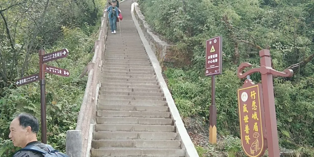 起於凌霄亭,止於壽星橋,是峨眉山徒步遊玩中非常艱難的一段山路。傳說當年普賢來峨眉山建道場之初,路過此地,見這里山勢高峻,地勢奇特,便授意靈祖菩薩指揮隨行三千力士同時動手,每人修一級台階。三千石級由此得來,靈祖驗收時一數,恰好石階有九十九道拐,此坡因此而得名。