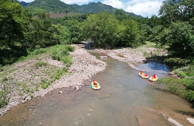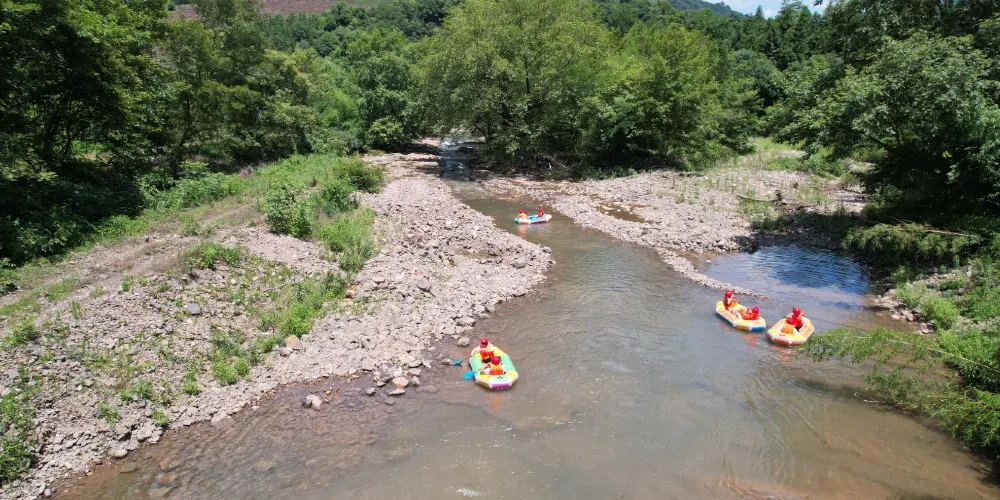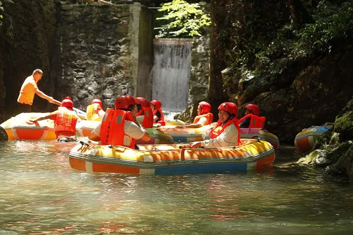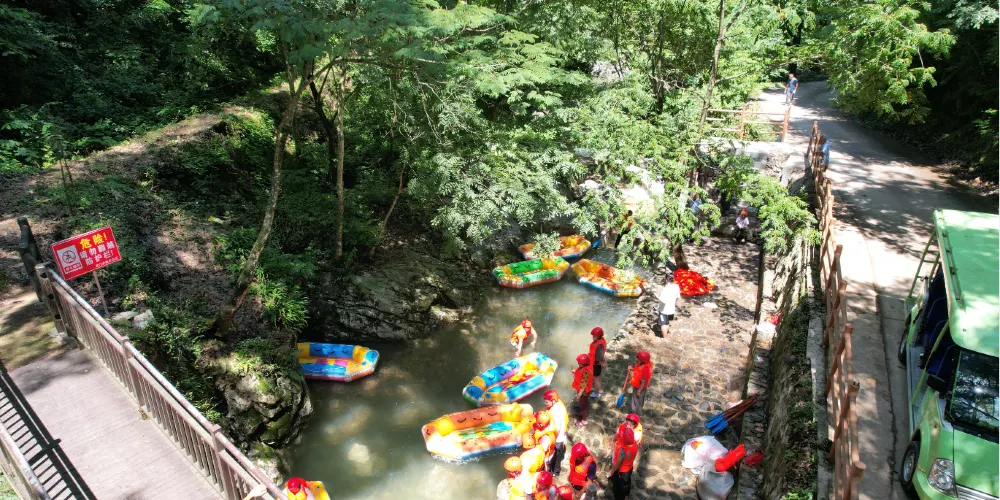 水墨汀溪風景區以原生態的自然風光為主,流水和竹林伴隨著步道,不時能見到瀑布,也有漂流、滑翔傘這樣的遊樂設施,適合週末休閒遊。你可以選擇坐觀光車到深處,一路看山看水,如果想要尋求刺激,可以玩一下吊在滑索下的滑翔傘,感受下迅疾的風速帶來的快感。