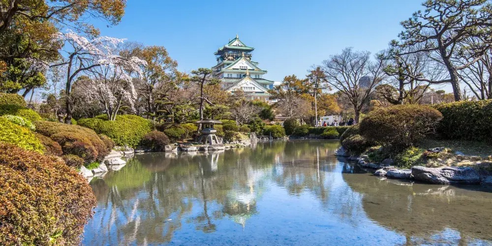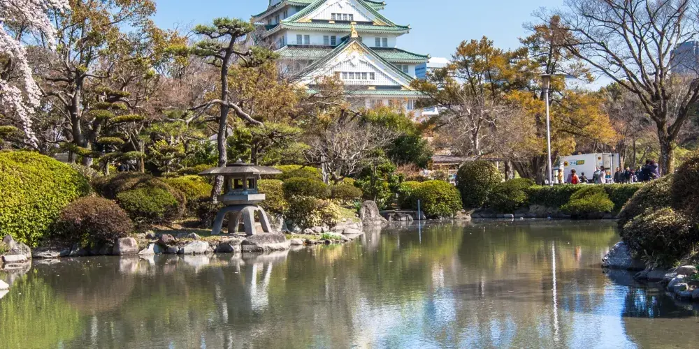 大阪城公園位於大阪的中央,園內的標誌性景觀是大阪城天守閣,還有可以欣賞四季花卉的西之丸庭園和大阪城梅林,軟式棒球場、野外音樂堂、橄欖球足球場等公共設施也很齊全。大阪城公園內植被茂盛,每到花季便會有成群的遊客來此參觀。