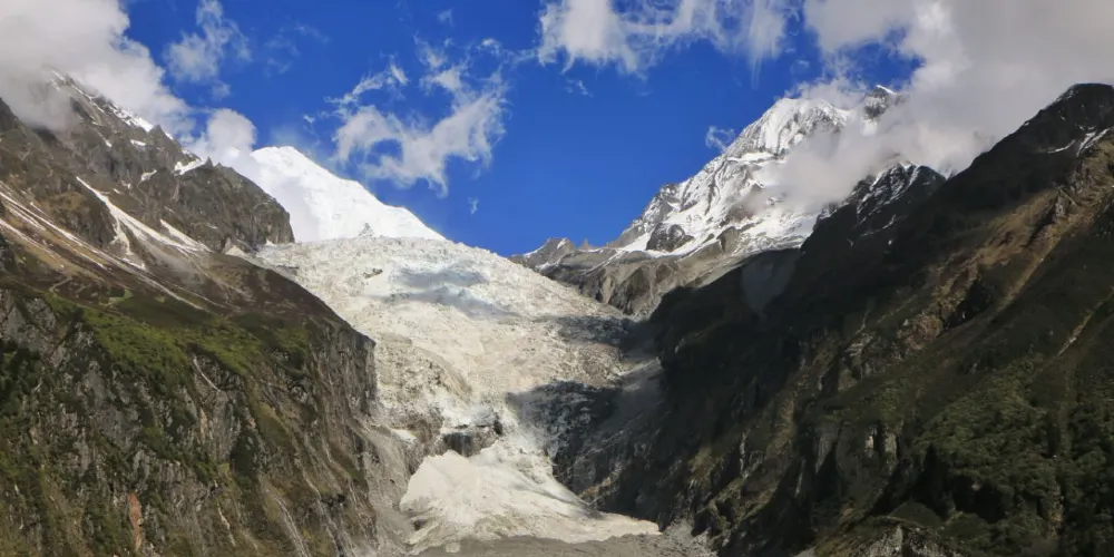 大冰瀑布屬於海螺溝冰川,是海螺溝冰川的三大冰川之一。沿海螺溝冰川往上走,繞過黑松林,就可以看見這條大冰瀑布。大冰瀑布由無數巨大的冰塊組成,彷彿從藍天洩下的一道銀河。大冰瀑布不但是低緯度低海撥的冰川,而且是落差很大的冰川。