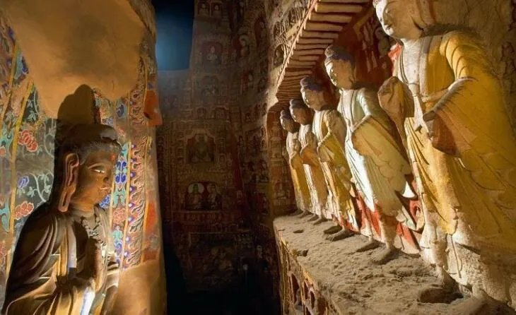 第九窟窟門為仿中國傳統廡殿式建築,兩側對稱布龕,中西合璧,具有濃厚的裝飾意味。窟內四壁分層布龕,造像題材多出自《法華經》。窟頂格狀,格內雕團蓮及飛天,八夜叉體魄健碩,力舉萬鈞,單手承托橫枋。後室北壁主像雕釋迦,東西兩壁各一脅侍菩薩。
