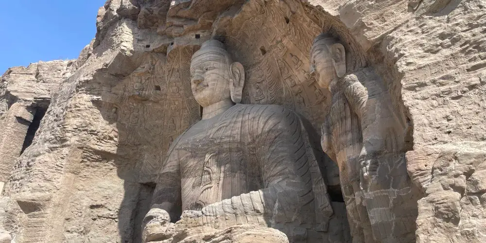 雲崗石窟第20窟是雲崗的露天大佛,據説以北魏開國皇帝道武帝的形象為原型雕刻而成。立像是三大佛,正中的釋迦坐像,在雲崗石窟中部西隅,編號第二十窟,造像露天,主像是釋迦坐像,高13.7米,胸部以上石質堅硬,保存完好,兩肩寬厚,面形豐圓,薄脣高鼻,神情肅穆。身軀微微前傾、嘴角稜角分明,彷彿在向眾生宣講着佛教的真話,細細的彎眉和微啟的雙目,使人感到慈祥為懷的氣度。背光的火焰紋和坐佛、飛天等浮雕十分華美,把主佛襯託得雄渾大氣露天大佛背光外緣西壁的殘飛天是雲岡石窟有代表性的飛天,可以稱之為“菩薩型飛天”。飛天頭戴花冠,頸佩珠環,通體長裙,手捧鮮花,身段微屈,狀己凌空,但姿態卻端莊沉穩,面相虔敬有別於一般的飛天。這尊露天雕像大佛全身比例適稱,造型手法簡練概括,身軀寬闊給人以穩健之感,據有佛的“三十二相、八十種隨形好”的精神風貌。雖是坐姿,但卻分外高大,它不僅是雲岡石刻中的傑作,在全國來説,也是佛像藝術中的精品。