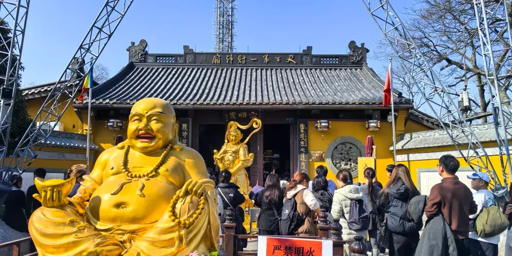 靈隱寺背靠北高峰、面朝飛來峰,飛來峰雖然山不高,但山上有許多奇幻多變的洞壑,更遍佈著五代以來的佛教石窟造像多達三百四十餘尊,是我國江南少見的古代石窟藝術瑰寶。寺廟常年香火旺盛,特別是在初一、十五或者佛教盛日,善男信女從四面八方而來,更是人山人海。