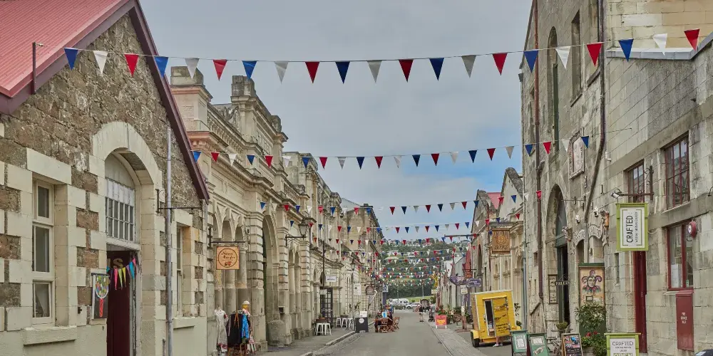 奧瑪魯Oamaru的Tyne St是一條充滿藝術味道的老街,它所在的這個區被稱做奧瑪魯曆史城區。Tyne St裡面的建築用的材料大部分是用本地的石灰岩(又叫“奧瑪魯石”或白石),這種材料從19世紀開始使用。這裡面的建築風格主要是流行的古典形式,從哥特複興式到新古典意大利和威尼斯宮殿的形式都能在這裡找得到