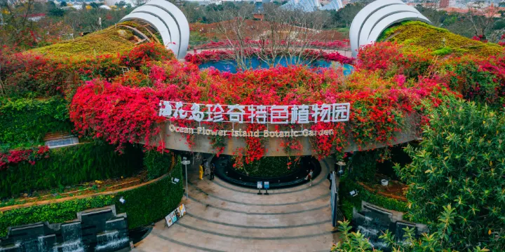 海花島珍奇特色植物園位於海花島1號島“風情三條街區”,佔地約7.4萬平方米,集珍稀植物觀賞、花事花展、主題活動、科普教育於一體。園區內設有“五區一館”,分別是主入口區、花田花海區、廕生植物區、假山瀑布區、奇花異果區和植物奇珍館,其中主入口區設有主題餐飲、紀念品商店等服務設施。植物園現有各類植物200餘種,其中珍奇特色植物40餘種,如彌勒佛樹、橡膠榕、樹菠蘿、象腿樹等,彙集全球熱帶珍奇植物,漫步園中,一步一景,一步一燈。主入口區 植物園主入口區的垂直綠化主要是以鴨腳木、天門冬、金葉假連翹、腎蕨、黃金榕為主,有着歡迎與一帆風順的寓意。花田花海區 花田花海主要是分梯田花海和大花海為主,目前種了很多的波斯菊。花海景觀有彩葉草、紅草、狼尾草以及粉黛亂子草;特色花植有香水合歡、黃槐決明、粉花山扁豆、黃嬋、琴葉珊瑚、雞冠刺桐、雞蛋花。 奇花異果區 奇花異果區有蘑菇樂園,裏面有蘑菇雕塑,小孩子可以在蘑菇區參與探險解密、益智互動類、親子類主題活動;植被有土沉香、“彌勒佛樹”、鐵西瓜、樹屋、棧道、聚果榕、龍船花、火燒花、千層蕉、象腿木。假山瀑布區 植物園特意打造的一處納涼休憩的場所,山頂有一座涼亭,是植物園的制高點,在此處休憩,微風帶着花海飄來的淡淡清香,園內美景一覽無餘。 廕生植物區 整體採用半嵌入式設計,屋頂花園與周邊環境融合為一,鏤空天井增添內部自然採光,形成由空中棧道聯結的二層空間。底層是特色綠島和花境,以及各式各樣的廕生植物,站在二層觀景棧道也可遙望觀賞對面的立體花海和假山美景,美景美色應如是,便勝卻人間無數。