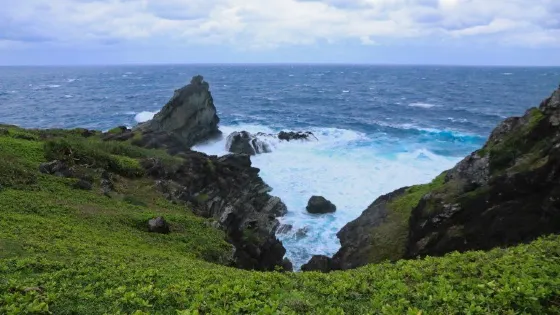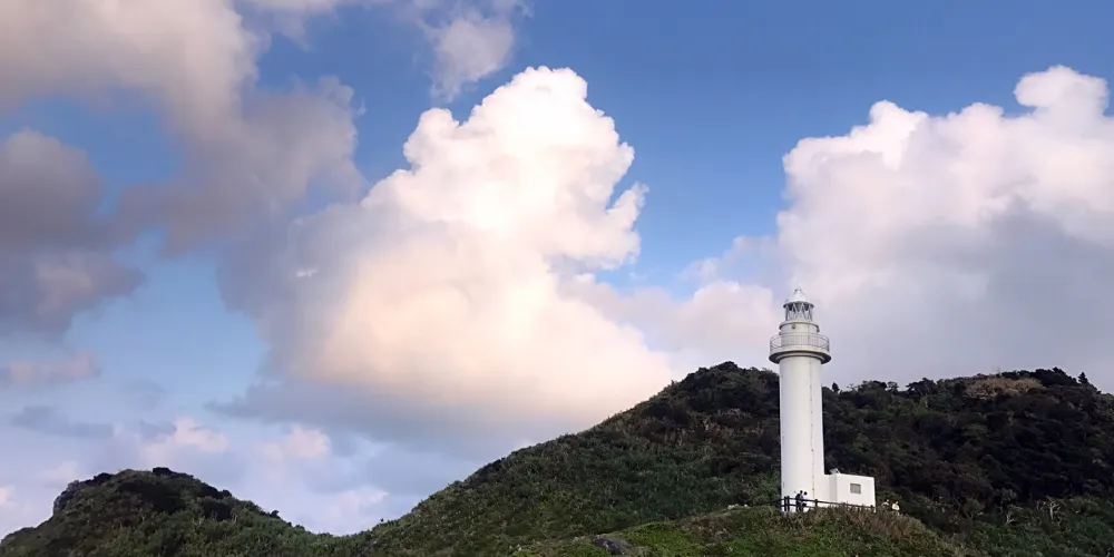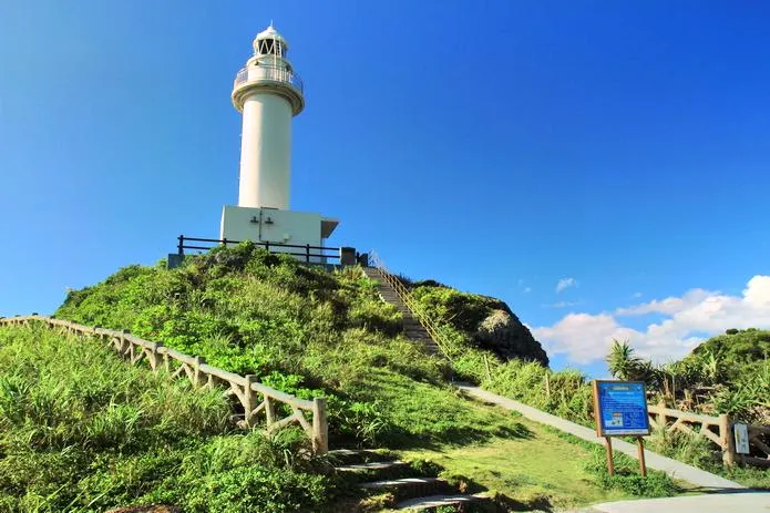 御神崎是位於石垣島西端斷崖絕壁的海角美景,據說是石垣島欣賞夕陽的絕佳地點。沿著石階登上雪白燈塔時,左邊可眺望蔚藍而又澎湃的海景,右邊則是嶙峋的奇岩峭壁,還有海底美麗的珊瑚礁。日落極美,除日落景外,還有不同的植物風景,交織出很美麗的圖畫。