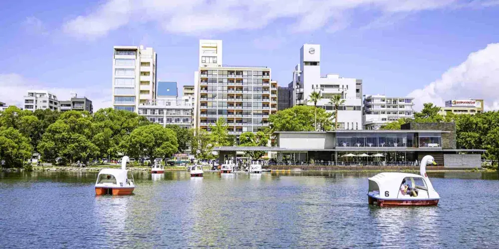 大濠公園位於福岡城西,公園圍繞福岡城的護城河修建而成,造型仿杭州西湖。園內設置有日本庭園、能樂堂、福岡市美術館、餐廳等設施。它是日本僅有的幾個水上公園之一,擁有一個池塘,園內又以一座橋連接4個綠意盎然的小島嶼。池畔種滿迎風搖曳的垂柳、花容秀麗的杜鵑,為整個公園增添不少美麗的氣息。以大濠公園為會場的花火大會也是福岡人夏天的盛事之一。