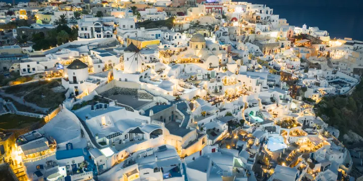 伊亞小鎮是聖托里尼島的第二大城鎮,藍白教堂和傳統的風車是這裡的標誌性建築,特色的藍白房子與愛琴海融為一體,充滿了浪漫的感覺,這裡也成了有名的蜜月旅行地。除了特色的建築,許多遊人來此還為了欣賞美麗的日落。傍晚時分,在落日觀景點會聚集很多人,等待欣賞太陽慢慢消失在愛琴海中。當海面只剩下一片餘暉,人們就會一起鼓掌,讚美這美麗的夕陽。