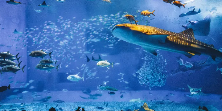 而稱為「黑潮之海」的巨大水槽內,有著世界上最大的魚類-鯨鯊,以及於世上首次人工繁殖成功的鬼蝠魟,充滿魄力的展示空間讓人目不暇給。於「深層之海」區域,再現神秘的沖繩深海,彷彿被沖繩的海洋所包圍,進入了海底世界。