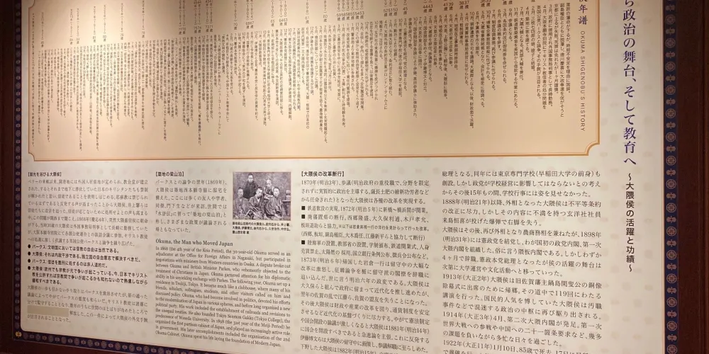 佐賀出身的大隈重信是早稻田大學的創辦人,也是明治維新時期日本舉足輕重的政治人物,曾經兩度出人日本首相,可謂為近代日本鋪下基石的風雲人物。大隈紀念館建於大隈重信故居旁邊,館內展示有關於大隈重信的珍貴曆史資料及物品。