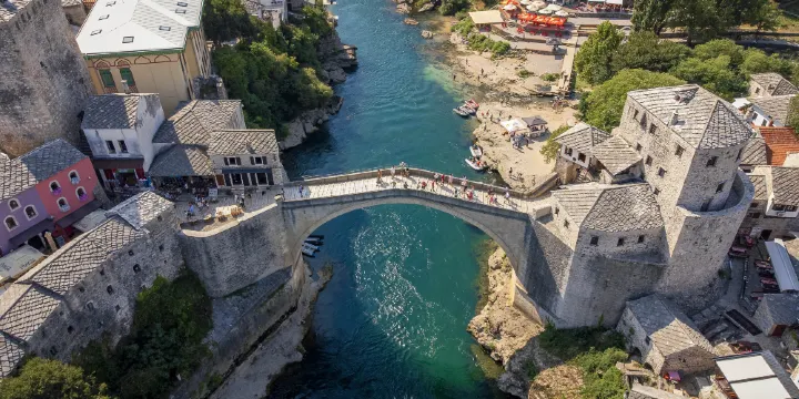 莫斯塔爾古橋是莫斯塔爾的一座16世紀的橋樑,橫跨內雷特瓦河,是莫斯塔爾的地標建築。不幸的是,古橋在90年代的波士尼亞戰爭中被摧毀,戰後開始重建,並於2004年7月23日重新開放。 2005年,該橋及週邊地區被聯合國教科文組織列為世界遺產。