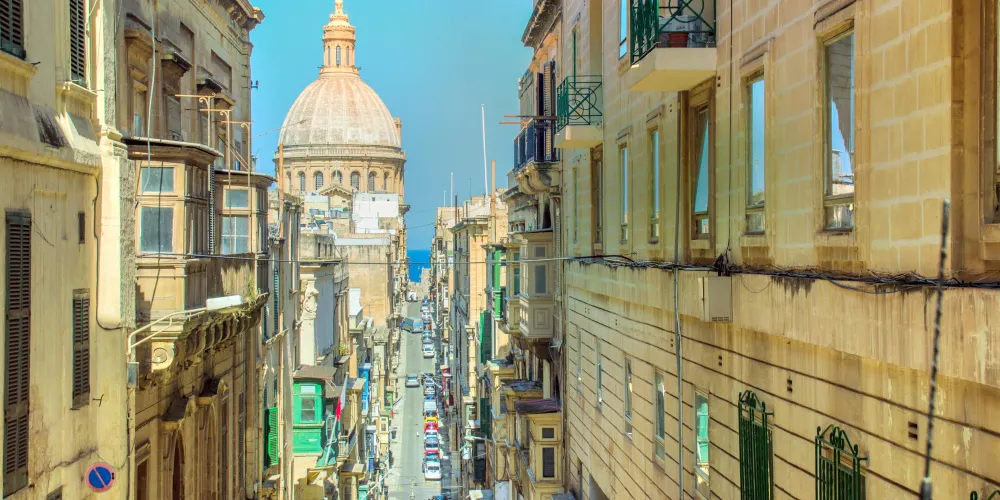 漫步在舊薄荷街,可以感受到瓦萊塔的歷史氛圍。街道的盡頭有巴洛克風格的圓頂教堂,與藍天碧海相互襯托。街道上房屋依勢而建,沒有高樓,每間房屋都有彩色陽台,路邊還有英國老式紅色電話亭。