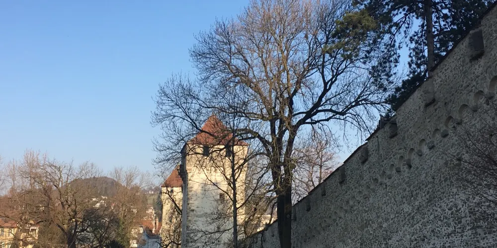 “Spreuer”一詞在德語中有“穀殼”的意思,當時這座橋是唯一能將麥殼傾倒入河的地方,因此也叫穀糠橋。過橋走向北岸,左前方就是去往穆塞格城牆的路。