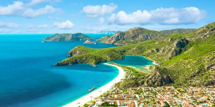 土耳其死海海灘綿長規整,潔白色沙灘呈圓弧狀擁抱著如夢似幻、波瀾不驚的藍色大海。沙灘背後的山谷間遍植綠松,藍白綠相間的色彩盛宴,讓這裡被譽為世界上讓人心動的海灘。