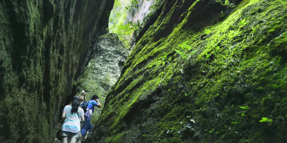 武夷山風景名勝區-一線天景區主要景點有:樓閣樓和藍岩(天心明月)、石門岩(石門飛泉)等。在一線天的天崖縫中,常有罕見的哺乳動物白蝙蝠,洞邊有竹中奇珍四方竹。右邊是伏羲洞,中間為風洞,左為靈岩洞。