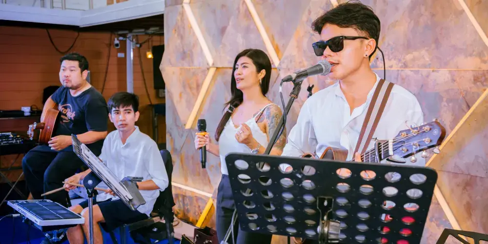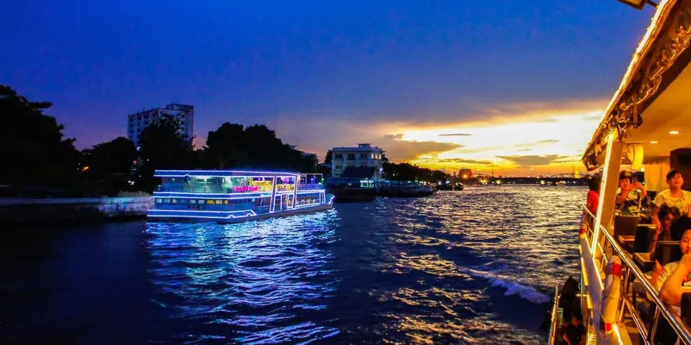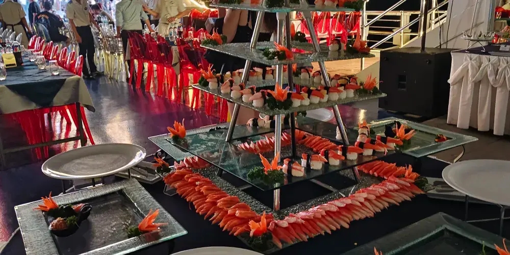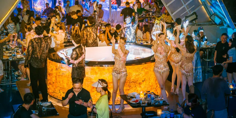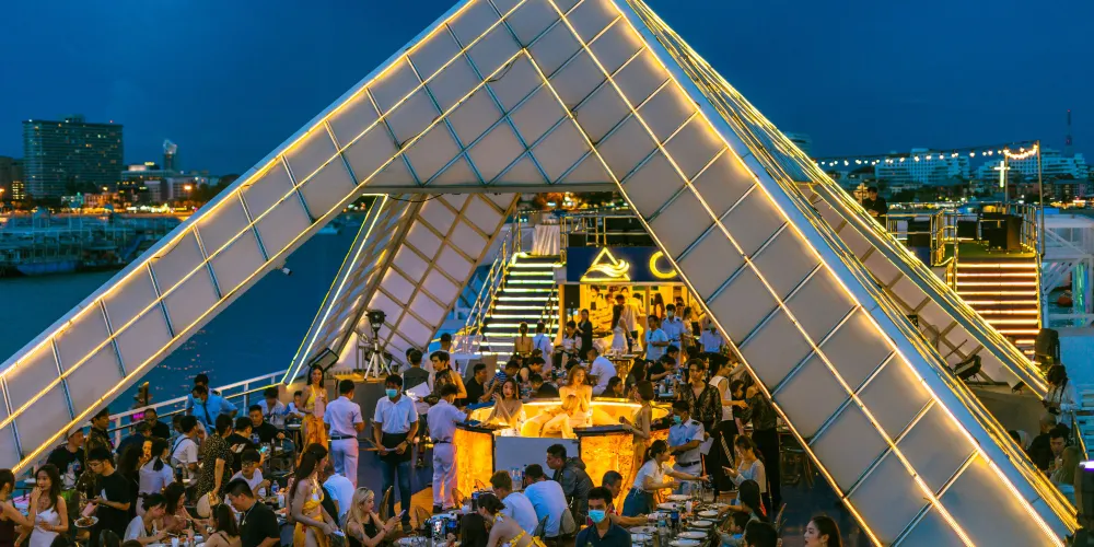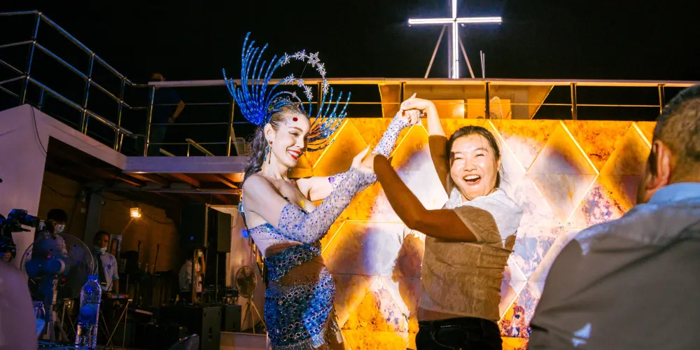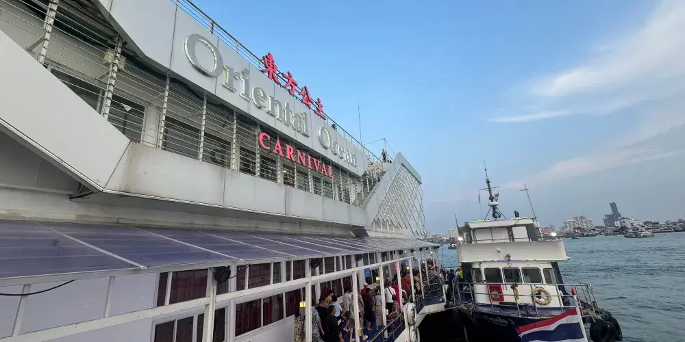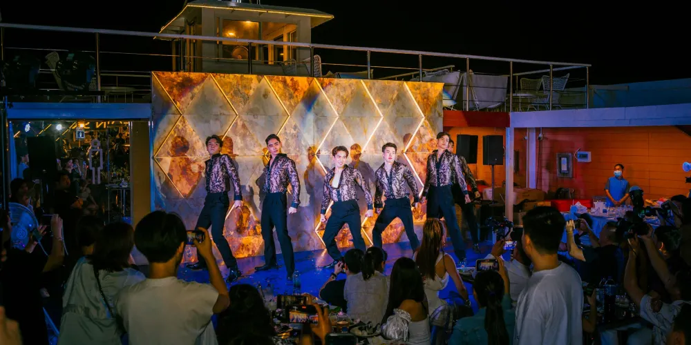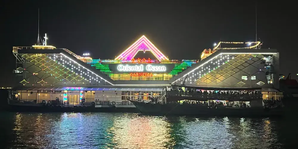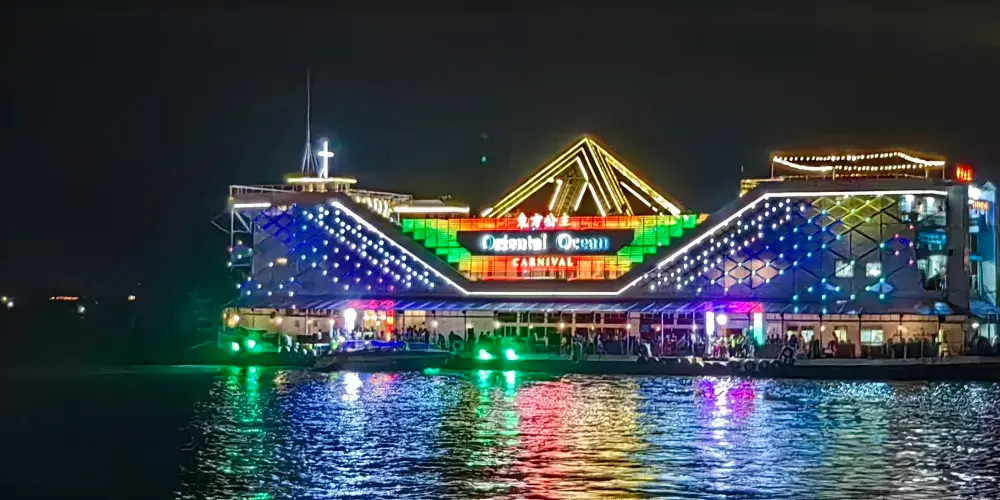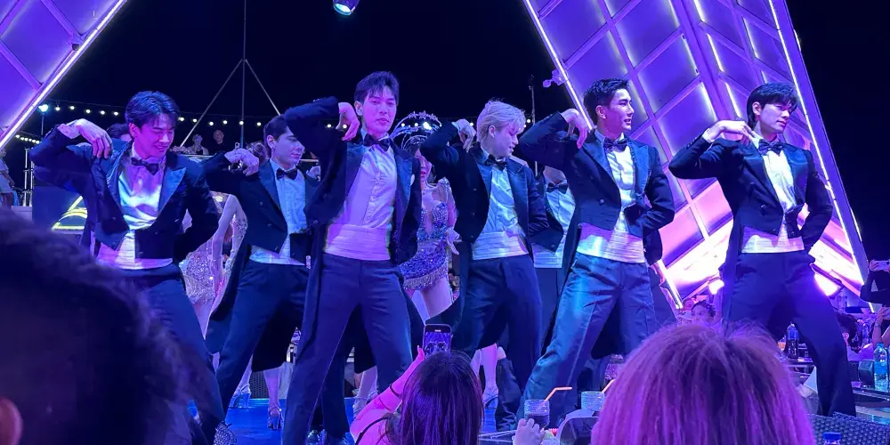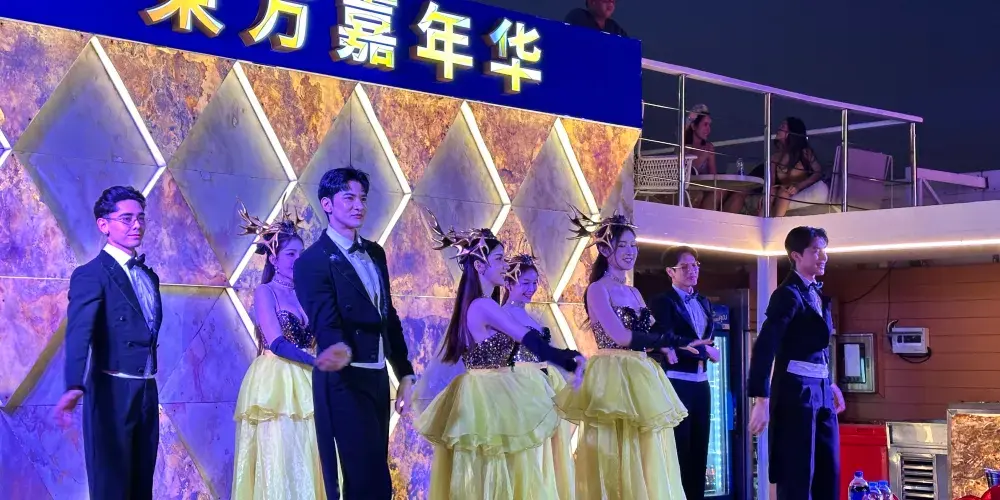▾在遊船的三層“東方公主號”遊船(Ocean Sky)餐廳,可以一邊感受海風拂面,一邊觀看男模女模的歌舞表演