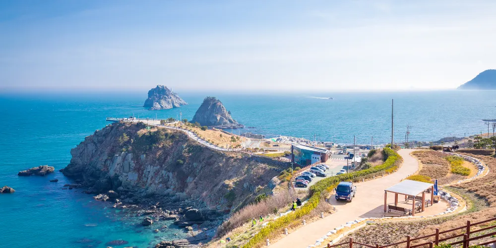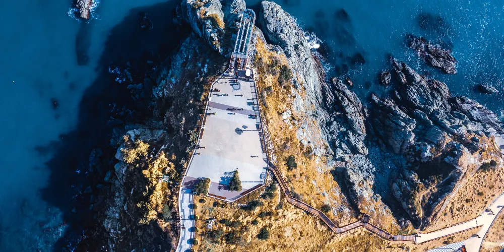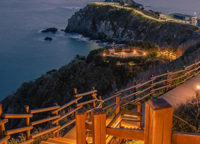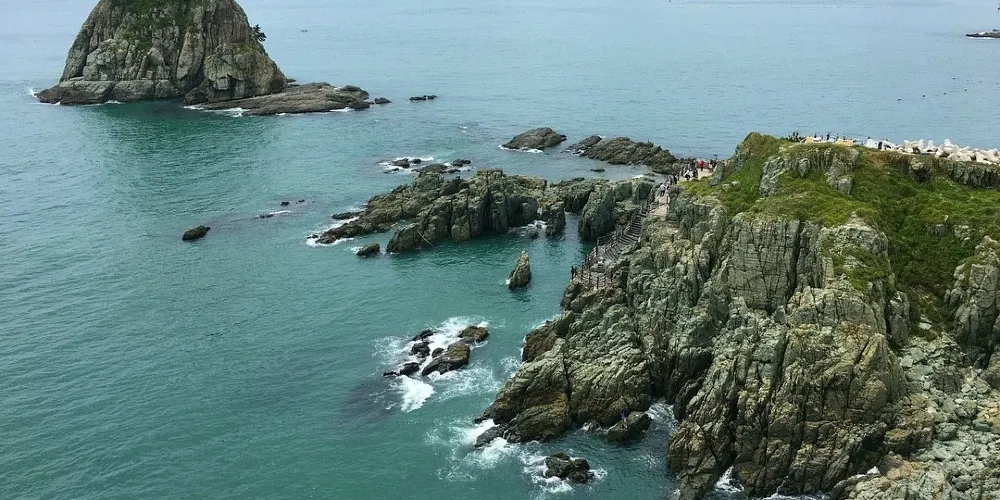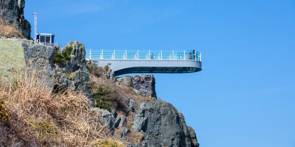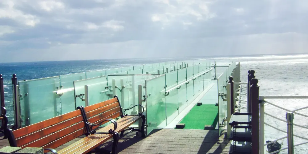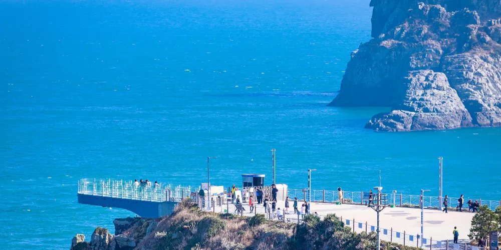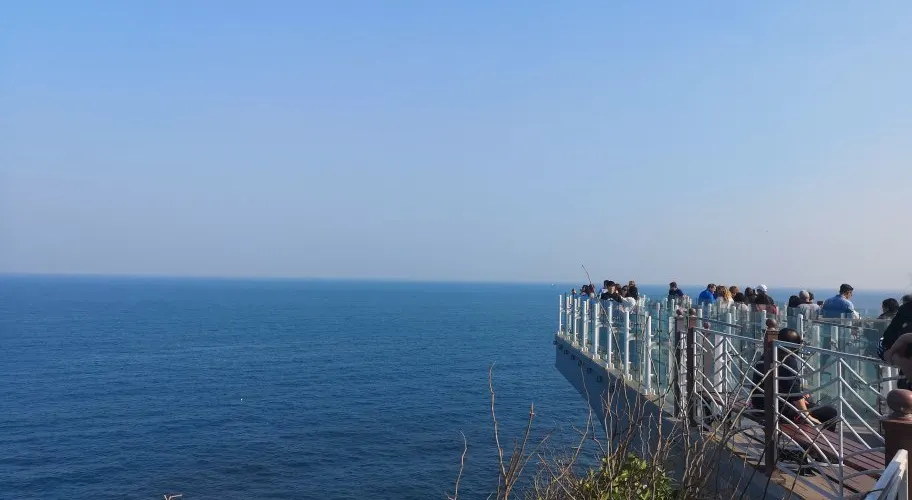 五六島天空步道位於韓國釜山,是個備受歡迎的觀景點,吸引著許多遊客前來體驗。步道懸掛在海面之上,採用玻璃地板設計,遊客可以透過腳下的透明玻璃,直接俯瞰到波濤洶湧的海浪,感受如臨空中的刺激與震撼。步道全長約15米,雖然不長,但其獨特的設計和壯麗的海景使其成為釜山旅遊的亮點之一。