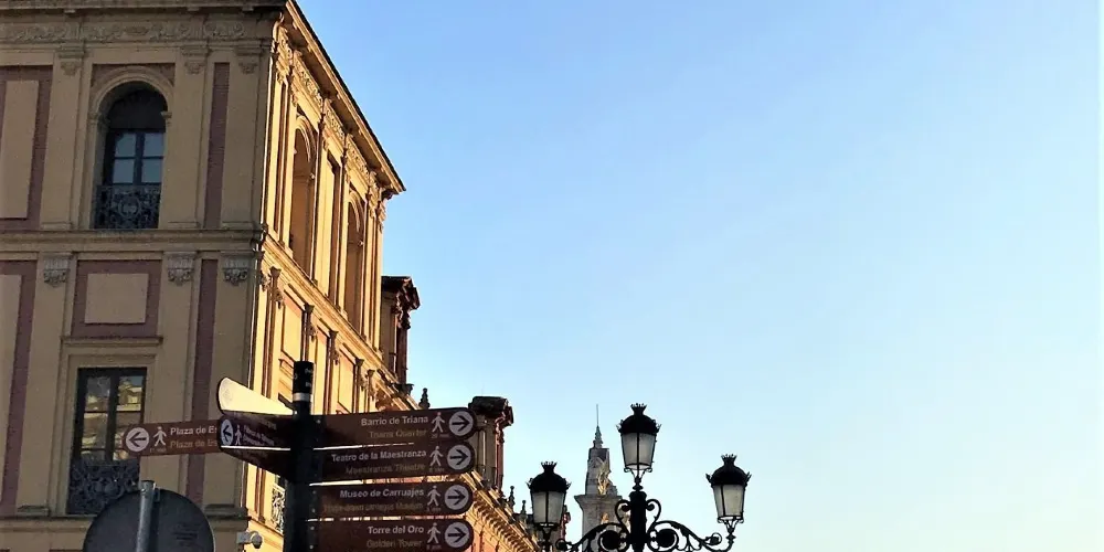 吉拉爾達塔是塞維利亞的地標,不論在城市的哪個位置都能看到這座98米左右高的建築。此塔由伊斯蘭教徒阿莫阿德家族於12世紀末主持修建,伊斯蘭風格濃鬱,從塔下仰視覺得塔尖很小,其實那是高4米,重1288公斤的青銅神像,據說在風中它還會來迴轉動,塔頂28個大鐘至今仍能用優美的音色為塞維利亞居民報時。