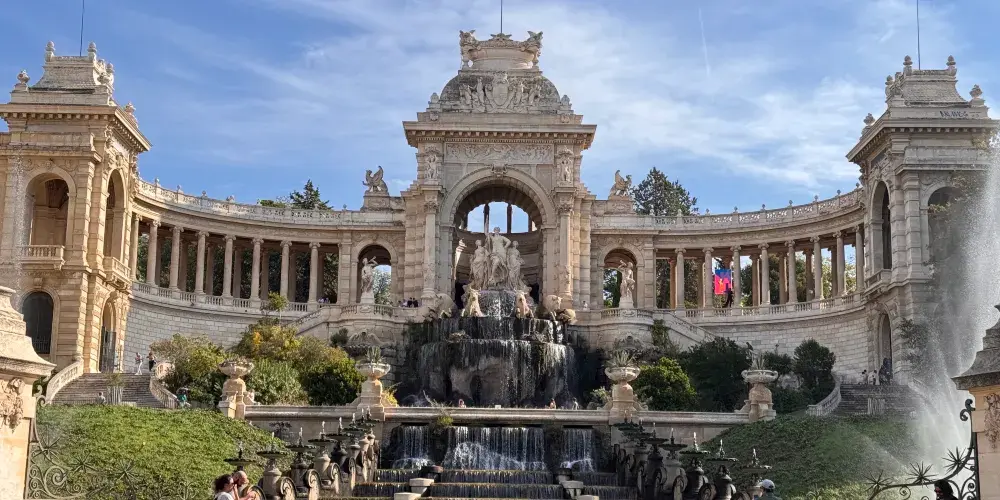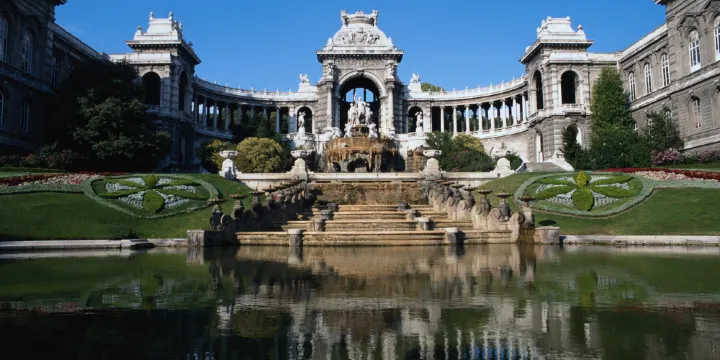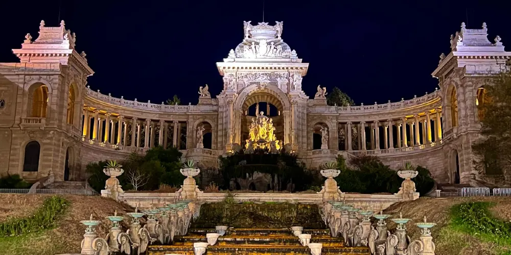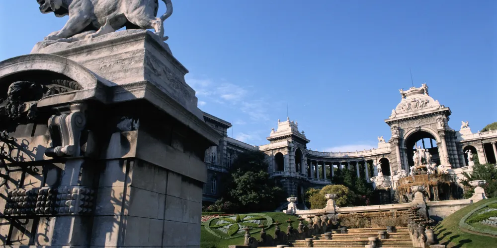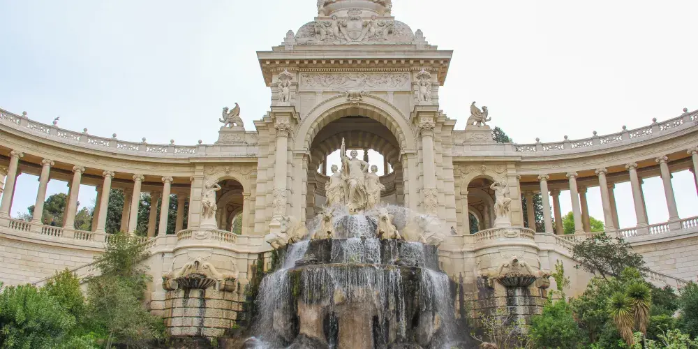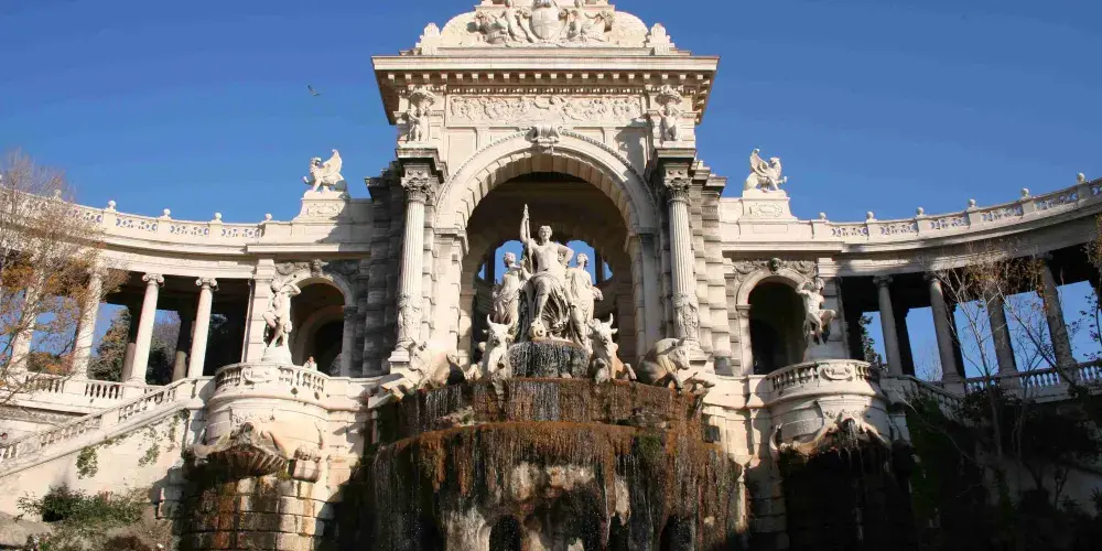 隆尚宮的基本格局為:中央是群雕和大型噴泉,群雕中央是河神,兩邊延伸出的懷抱式迴廊,一端是馬賽最古老的博物館——美術博物館,另一端是自然曆史博物館,宮殿的背面是一個大公園。
