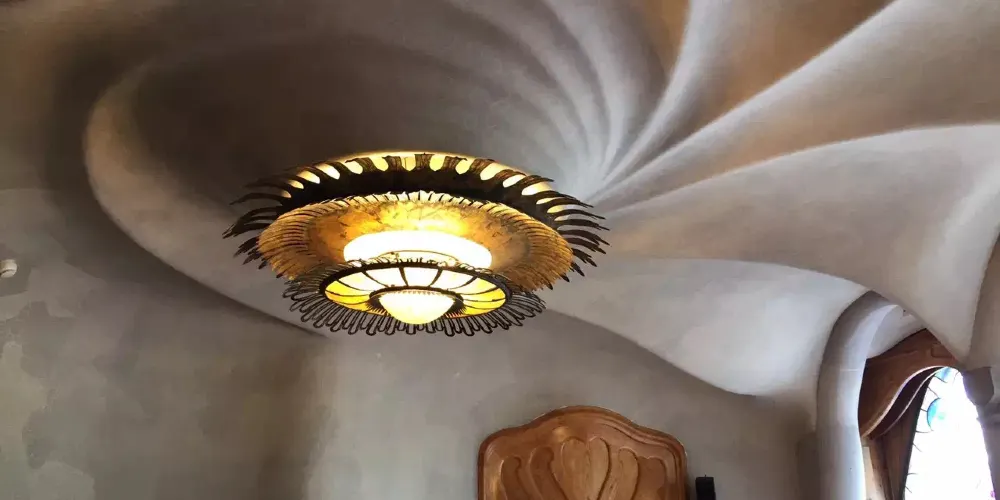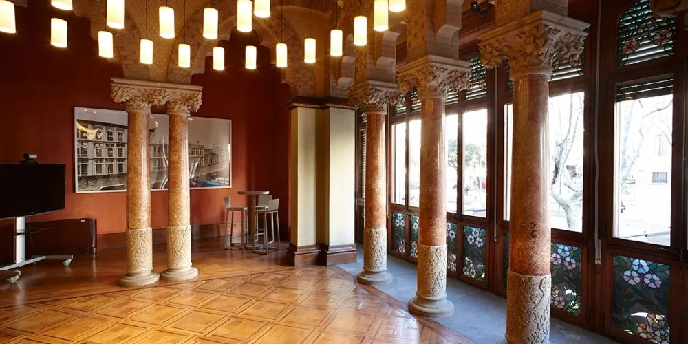 △ 大廳內部隨處可見的是充滿現代風味的工藝品。房間頂部是巨大的螺旋造型,像大海的漩渦一樣,漩渦中心是海葵樣的頂燈。一樓的大落地窗,可俯瞰格拉西亞大道。另一面還有一個陽台,陽台的門口有一個像人腿的立柱,通往一個現代主義風格的庭院,為各類大型活動提供了戶外空間。一樓的大落地窗,可俯瞰格拉西亞大道。