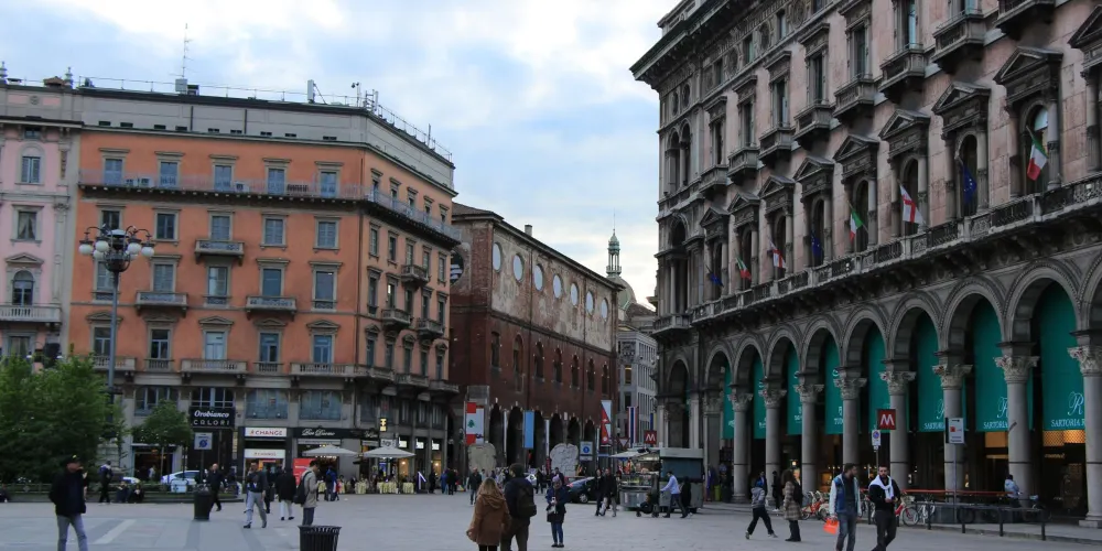 米蘭大教堂廣場位於米蘭市中心,周邊有很多重要的建築,其中米蘭的地標米蘭大教堂就坐落於此。廣場隨著大教堂的修建逐步發展起來,並以大教堂命名。廣場中央聳立著意大利王國第一任國王維多利奧·埃瑪努埃爾二世的騎馬銅像。廣場周邊還有埃馬努埃萊二世長廊、新古典主義建築風格的王宮、大教堂博物館等一系列的重要建築,散發出濃郁中世紀風情。廣場上可以看到成群悠閒信步的鴿子,有時到了傍晚還能看到隨興演出的街頭表演。廣場附近匯聚了很多商場、購物中心、精品專賣店和高級餐館,是米蘭知名的休閒購物區域。