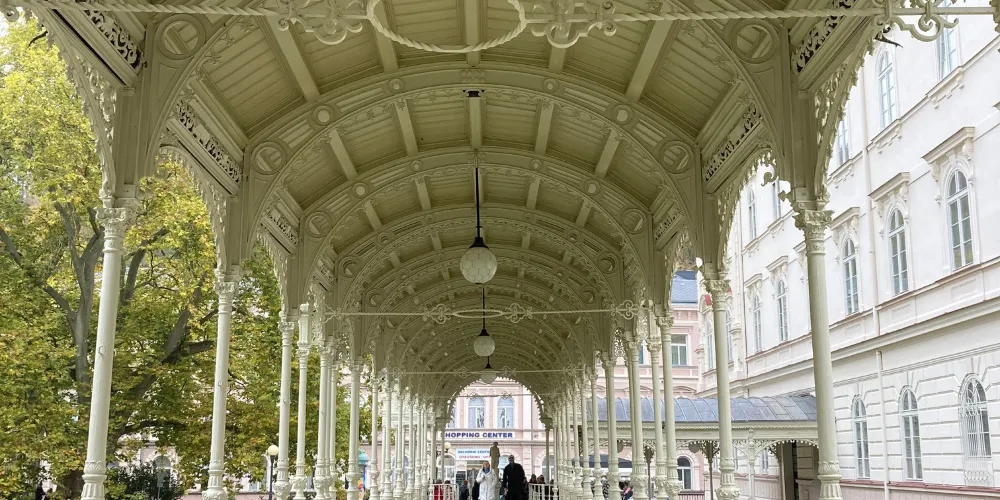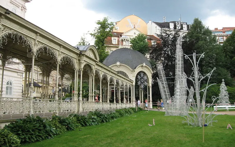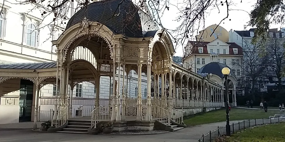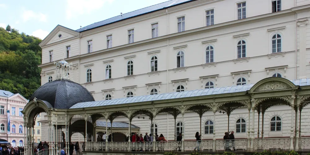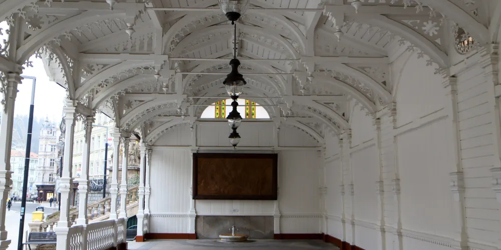 磨坊溫泉迴廊建於1871年,竣工於1881年,由布拉格國家劇院設計師約瑟夫·季迪克設計。長廊長132米,寬達13米,已成了卡羅維發利的傳統標誌之一。長廊有124根科林斯圓柱,柱廊上的12個雕塑代表一年中的12個月。