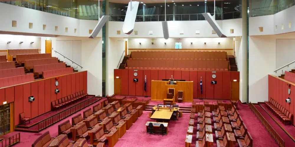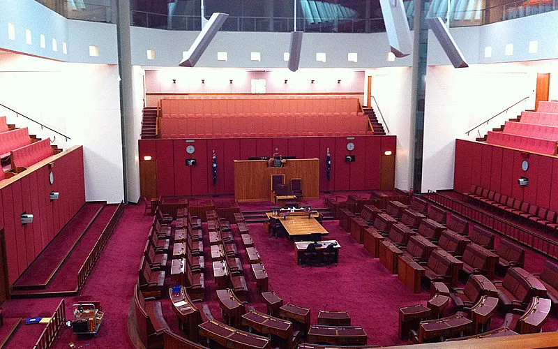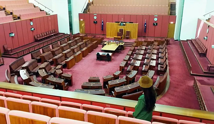 參議院的格式與眾院相同,但是是紅色的。參議員共有76席,每州12名,澳大利亞共有六個州:最西部是西澳大利亞州;中部上面是北領地;下面是南澳大利亞州;東部有三個州,從上往下為昆士蘭州;新南威爾士州和維多利亞州。首都堪培拉特區出兩名,土著人出兩名。在正中間議長坐席後有一把椅子是英國女皇的位置,平時是空的,在它旁邊還有一把椅子,是供外國元首參加會議時坐的。