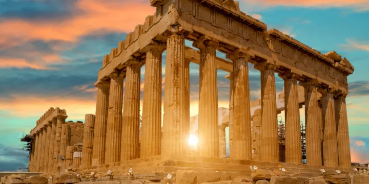 帕特農神廟位於希臘雅典的衛城上,是一座古希臘時期的重要建築,建於公元前5世紀。它是為雅典的守護神雅典娜而建,體現了古希臘人在建築和藝術方面的高超技藝。神廟採用多立克柱式風格,使用白色大理石建造,周圍環繞著一系列柱子,形成莊嚴的外觀。帕特農神廟不僅是宗教活動的中心,也是雅典政治和文化生活的重要場所。儘管經歷了歷史的變遷和損毀,這座建築仍然是古希臘文明的象徵之一,吸引著世界各地的遊客和學者前來探索和研究。