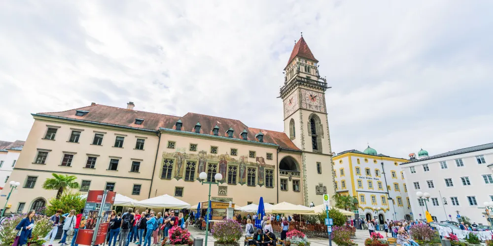 帕紹的老市政廳,建於1405年,是一幢有著哥特式鐘樓的房子, 外立面上描繪著帕紹的曆史人物,牆上的六個人像手中握著六面旗幟,其中有薩克森公共、科隆、提爾和巴伐利亞公國等的徽志。