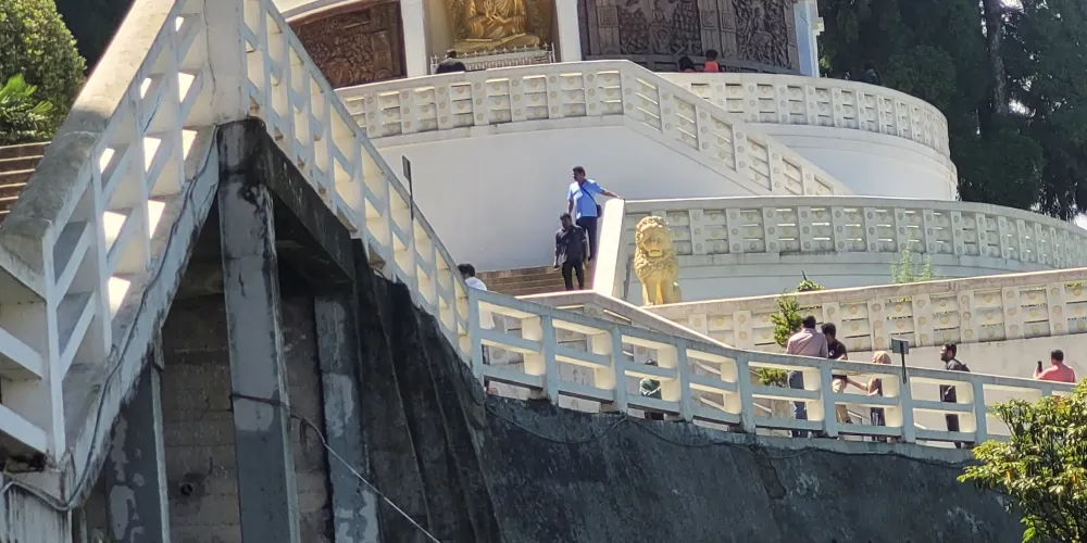 坐落在山穀間的日本山妙法寺,一片清幽寧靜,寺廟旁的建築是全世界第四座以山妙法師名義興建的佛塔,石塔上雕刻著佛陀成道的四段曆史,從這兒也可以遠眺群峰。清晨,和尚們會在園間漫步、擊鼓、誦經、祈禱,再至二樓佛堂禮佛;寺廟的空間不大,卻莊嚴祥和,從二樓佛堂木製的窗檯望出去,便是幹城章嘉峰,日式風格的寺廟外是簡單素雅的庭院,四周被高聳入雲的松樹圍繞著,像是遺世孤立的一方淨土,遊客可從山區漫步至此,沿路新鮮空氣與鳥叫蟲鳴相伴,很適合徒步,體驗當地的自然環境。