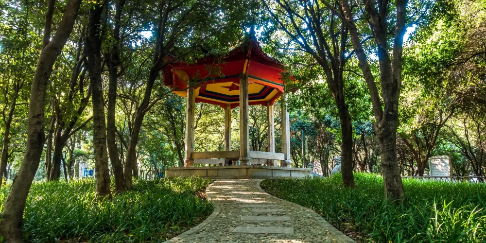 全湖分上、中、下三湖,佔地約12公頃。湖中修築了風格迥異的七星、八仙兩座橋樑,橋拱寬大,遊船暢通。湖內亭台樓閣,垂柳煙色,湖岸綠色蔥蘢,鮮花妖豔,素有“妙絕 西湖勝虎丘”的美譽。主要景點有發源殿、岸花亭、雙壁坊、夕照亭等。另,還新建了兒童樂園、水謝、風車、花圃、溫室等。園內還經常舉辦花卉、書畫、攝影等各種小型展覽,已成為湘潭市民和外地遊客娛樂、休息的中心場所。湘潭市一年一度的菊花展也在這裡舉行,各類菊花群相爭豔,為湖色增添無限風情。