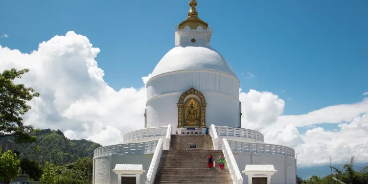 和平塔是一座矗立在費瓦湖南岸山脊上的白色佛塔,四面分別供奉四尊鍍金佛像,代表不同國家的佛教文化。佛塔坐落於海拔約1100公尺的阿納杜山上,是俯瞰博卡拉全景的觀景點之一。從這裡可以遠眺費瓦湖的碧波、博卡拉城區的紅頂房屋,以及喜馬拉雅山脈的安納普爾納峰和魚尾峰,尤其在日出日落時分,雪山與霞光交相輝映,景色震撼。遊客通常從費瓦湖搭乘擺渡船至山腳,再徒步1小時登頂,沿途可欣賞梯田和山間鳥類的自然生態。作為博卡拉的標誌性建築,和平塔不僅是佛教聖地,也吸引了追求心靈寧靜的旅行者,這座塔承載著對世界和平的祈願,成為尼泊爾「東方瑞士」富靈性的象徵之一。
