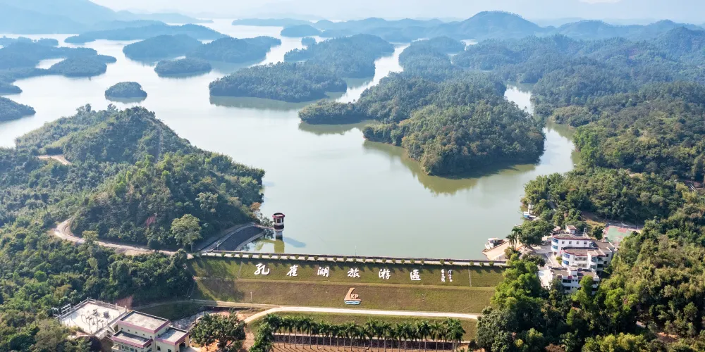孔雀湖又稱“大沙河水庫”,地處開平市西北部,距市區38公里,是一座人工湖。1958年興建,1960年落成,是江門市第三大水庫,擁有灌溉、防澇、發電、供水、養殖、造林等多種功能。孔雀湖羣山環抱,綠樹成蔭;湖水明凈如鏡,碧波萬頃;山中有湖,湖中有山,有為人津津樂道的“九牛戲水”,富有傳奇色彩的“狀元山”,勾人心絃的“水下城鎮”。登舟遠眺,便是雄偉的江門市較高峯——天露山。