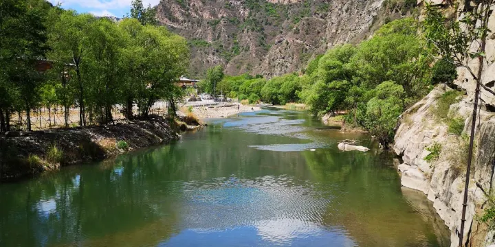 捧河灣風景區落於燕山腳下的密雲縣石城鎮捧河巖村境內,距市區約120公里,是一處集歷史文化、自然生態、人文景觀為一體的休閑、度假的紅色旅遊勝地。“水因山活,山因水動”。白河自燕山山脈西北引泉而出,蜿蜒百里,與周圍峻嶺秀林相映成趣,構成了一幅靈動的山水景畫。“一方水土養一方人”,白河哺育了百年“白河人家”,世代繁衍生息,民風淳樸,方寸之間透着濼濃的農家風味,清新的鄉土氣息帶您輕鬆迴歸原始生存狀態。景區景觀豐富,有千尺瀑布、天池、白雲湖、杏花潭、水流銀、中流砥柱、曲徑通幽、梯田今朝、春意盎然、林幽水靜、河道濕地、矗立峭壁、立佛卧佛、和諧共存等等,每一處景觀都能勾起美好的回憶和對大自然的嚮往。景區崖壁如刀削斧鑿,樹影憧憧,千尺白雲瀑陡然跌落絕壁之中,尺流直下,仰望瀑布,潭無俗水,瀑似白雲朵朵,隨景暢想,千姿心中意,恣意灑脱。