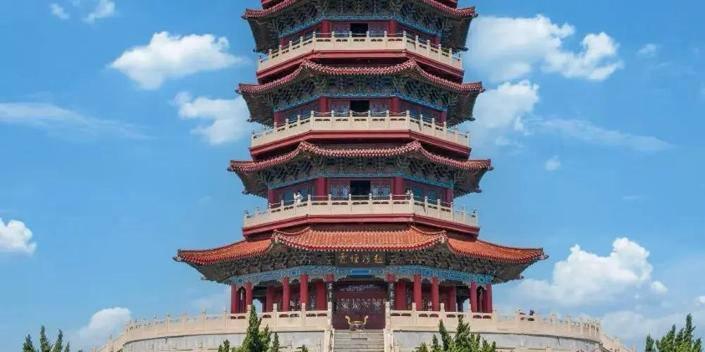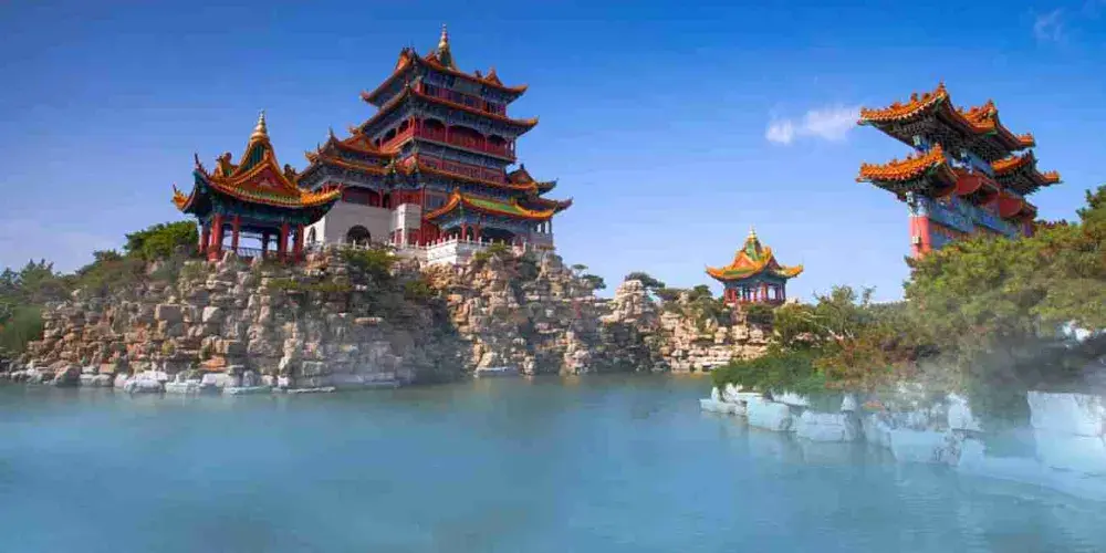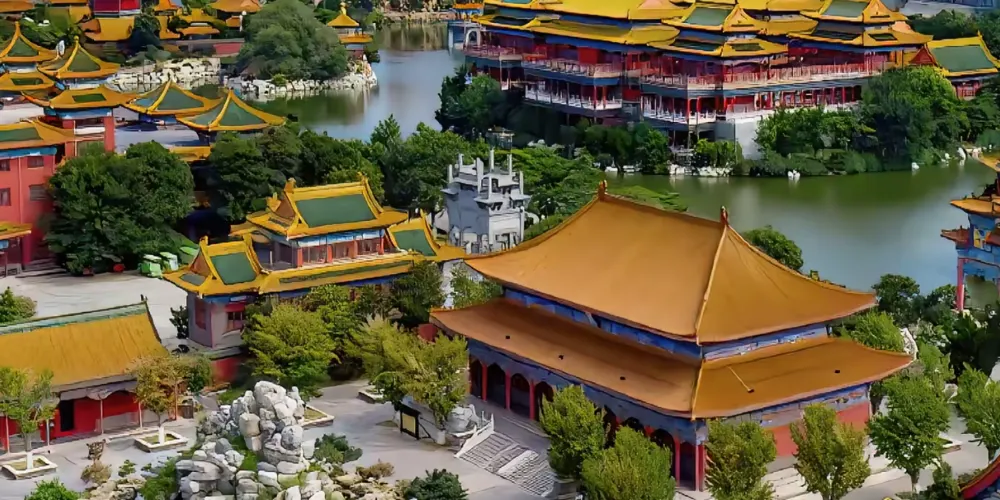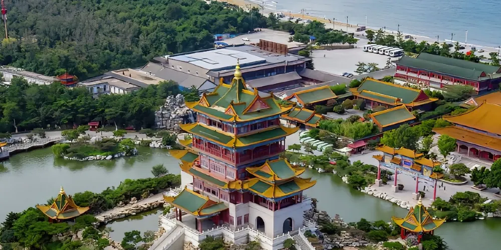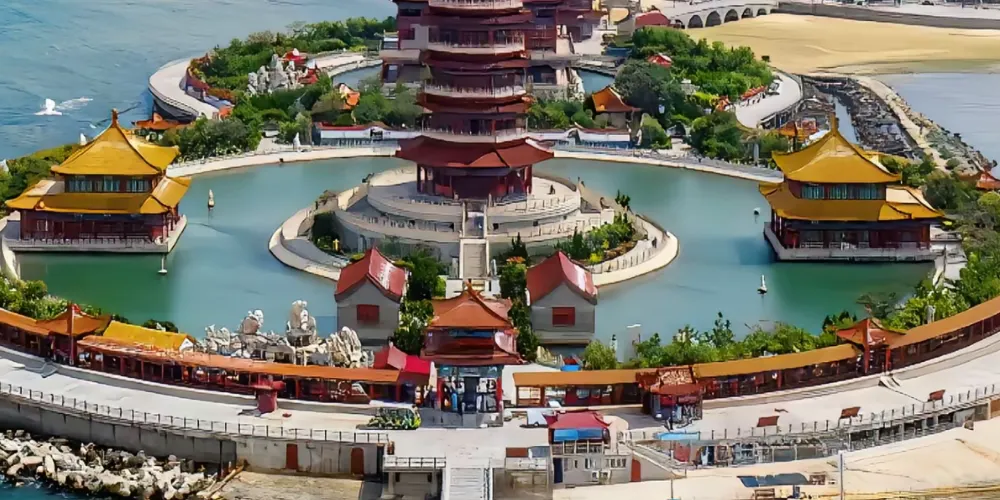 進入景區先來到和氣大殿,殿中供奉孔子、老子、釋迦牟尼像,其中釋迦牟尼佛像是用緬甸水白玉精雕而成,孔子像、老子像分別用紫銅鍍金彩繪而成,神態莊嚴。接著參觀園中的主體建築蓬萊仙島、方壺勝境、瀛洲仙境,均是建造在人工湖之中的巍峨建築,登上高閣可俯瞰園內全景。