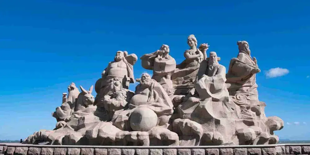 八仙過海景區位於蓬萊市北部的黃海之濱,有一座八仙橋將景區和海濱路相連。這裡是神話傳説中八仙過海的地方,景區內以“八仙過海”的傳説為主題,建有仿古亭閣與園林,你可以在此拜仙祈福、感受濃郁的道教文化氛圍,也可以隨處都能欣賞海景。景區內有八仙橋、仙源樓、望瀛樓、鐘鼓樓、八仙祠、會仙閣、拜仙壇等建築。八仙橋的前後各有一座牌坊,第一座牌坊的上額正面與背面分別刻有“八仙過海口”和“人間仙境”九個大字,均為北宋大文豪蘇東坡的手跡。遊覽指南走過八仙橋會看到仙源樓,這是進出景區的門樓,樓上方懸掛的匾額刻有“仙源”兩個大字,據説為唐太宗李世民題寫。樓後有一座拱月形影壁,稱為“八仙壁”,正中有六十四塊白玉方石連接而成的浮雕,描繪的是八仙過海的故事,栩栩如生。景區內有一大一小兩個湖泊,稱為“瑤池”。從八仙壁左右兩側可沿着環島觀光路步行遊覽,一路上可見到各種假山奇石。湖邊有個海豹島,可以與海豹零距離接觸。景區中部有座八仙祠,是一個獨立的院落建築,裏面可以上香祈福,八仙祠左右還各有一配殿,分別是祈福殿和財神殿。望瀛樓是建於小瑤池中的巍峨建築,它的一、二層是中華傳統藝術博物館,可以欣賞到各種珍奇玉器、瓷器等藝術品。其中有一幅用1888塊翡翠、象牙、玉石精雕而成、建國以來很大的漆雕鑲嵌壁畫《羣仙祝壽圖》,堪稱傳世之寶。此外還有曾國藩、紅學泰斗馮其庸等書寫的楹聯等珍貴藏品。會仙閣位於大瑤池中,是一棟有着地下一層和地上五層的仿古塔閣建築,是景區的標誌性建築,閣中供奉着道教非常有代表性的七十二位神仙。登上閣頂極目遠眺,碧海藍天盡收眼底。拜仙壇是景區的最後一個景觀,可在“八仙過海”的雕像前拜仙祈福,也可與“八仙過海處”石碑合影留念。