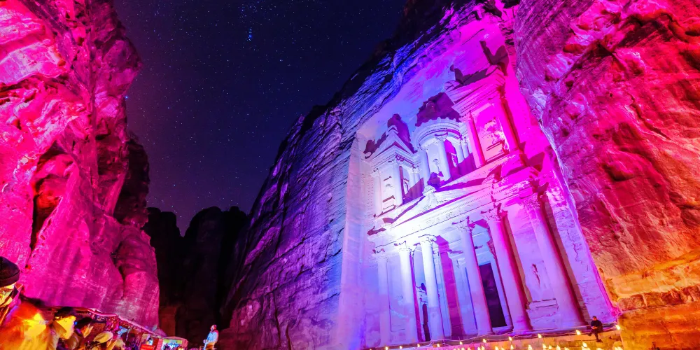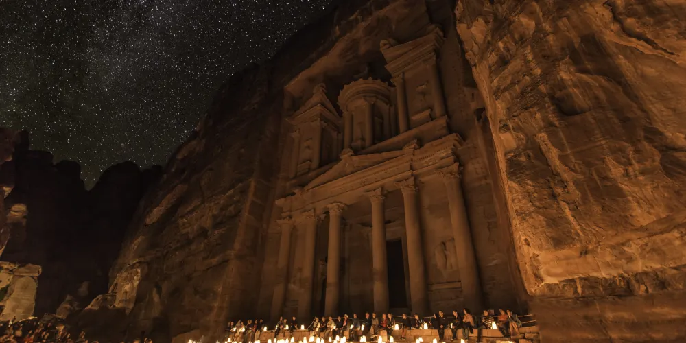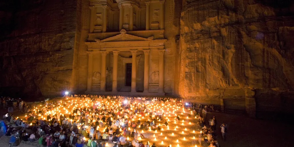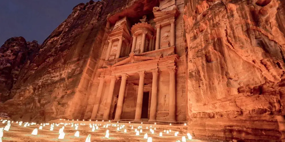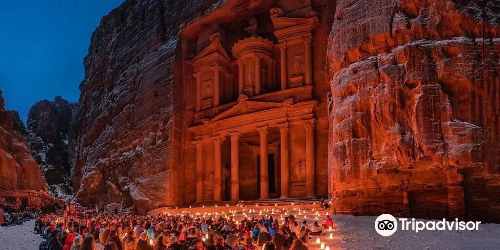 佩特拉之夜是約旦佩特拉古城的獨特體驗,活動通常在每週的特定晚上舉行,遊客可以在夜幕降臨後進入佩特拉,沿著蜿蜒的峽谷小徑步行至“卡茲尼神殿”。沿途,數千隻蠟燭點亮了道路,為這段旅程增添了浪漫和神秘的氛圍。到達神殿前,遊客會被安排坐下,欣賞傳統的約旦音樂表演和貝都因人的故事敘述。這些表演不僅增添了夜晚的文化色彩,也讓遊客更深入了解當地的歷史和傳統。整個活動大約持續兩個小時,是視覺和聽覺的雙重享受。建議遊客穿著舒適的鞋子,以便在沙地和石子路上行走。由於夜間氣溫較低,攜帶一件輕便的外套也是明智之舉。佩特拉之夜為遊客提供了一個在星空下探索古城的機會,是一次難忘的文化體驗。
