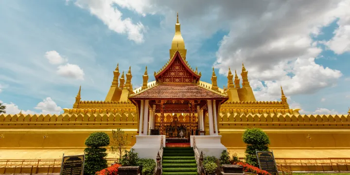 美麗的金色大佛塔是老撾非常重要的國家紀念碑,它是佛教和老撾主權國家共有的標誌。主塔形像還出現在了國徽裡。大佛塔屢經修繕,方保存至今,它建於1556年,是非常宏偉的一座老撾寺塔。大佛塔全身用真金覆蓋,即使是陰天也可以遠遠地看見這座金塔。