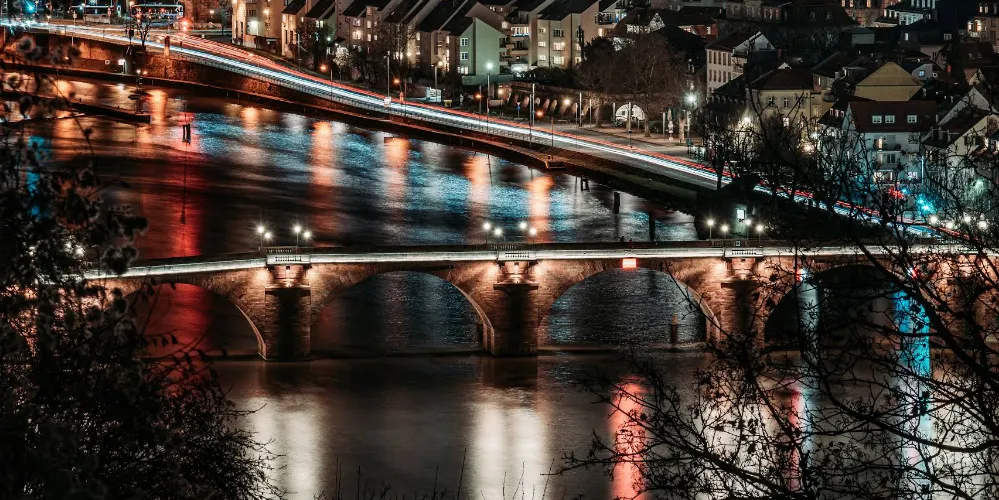 海德堡古橋有著九個拱門,若能坐在行經的船上,欣賞兩旁美麗的森林,古堡和河穀聚落,令人流連忘返。在橋上往山崗上一望,就是著名的海德堡城堡,河流、橋樑、城堡,構成海德堡最美的視覺焦點!