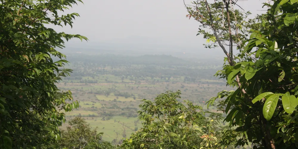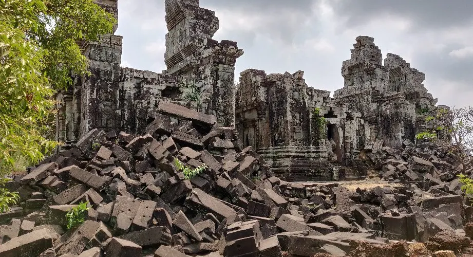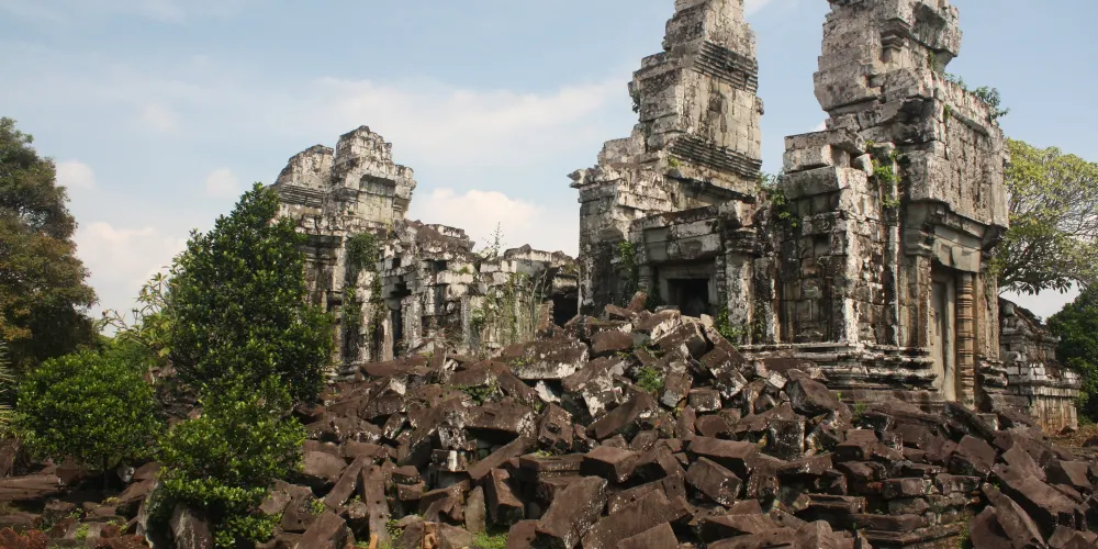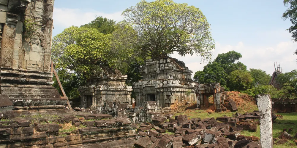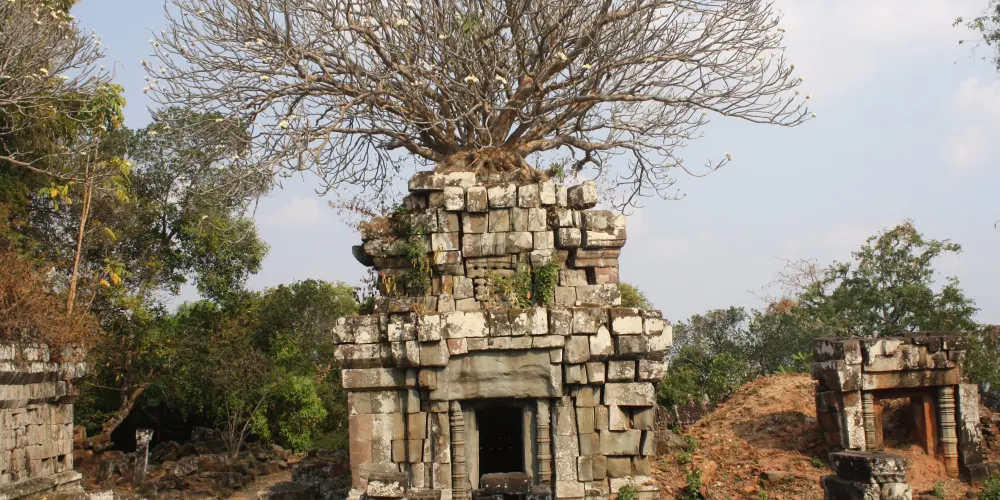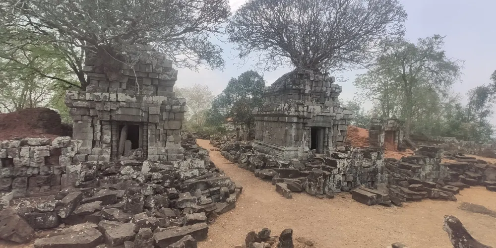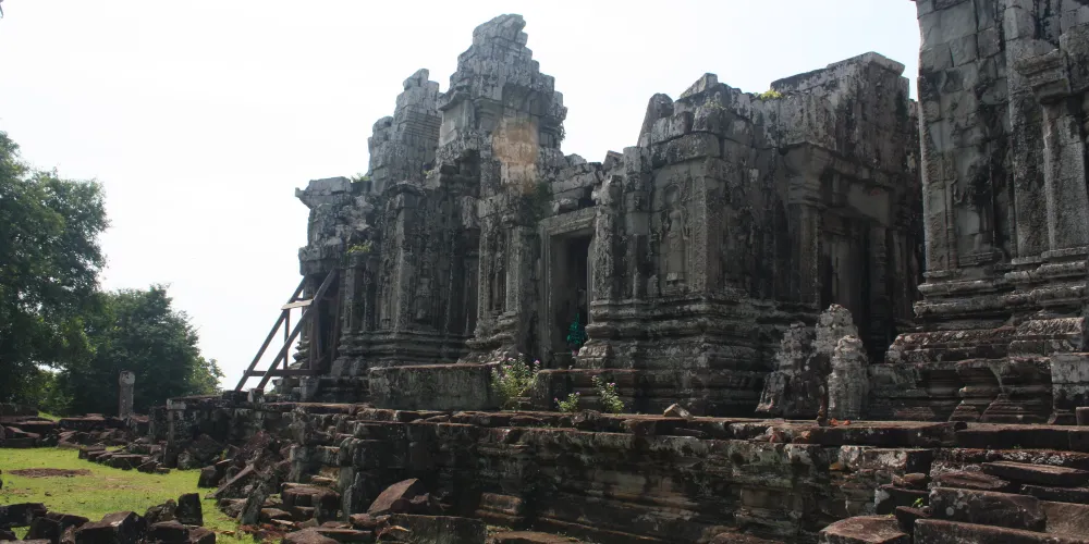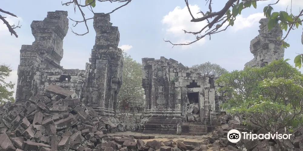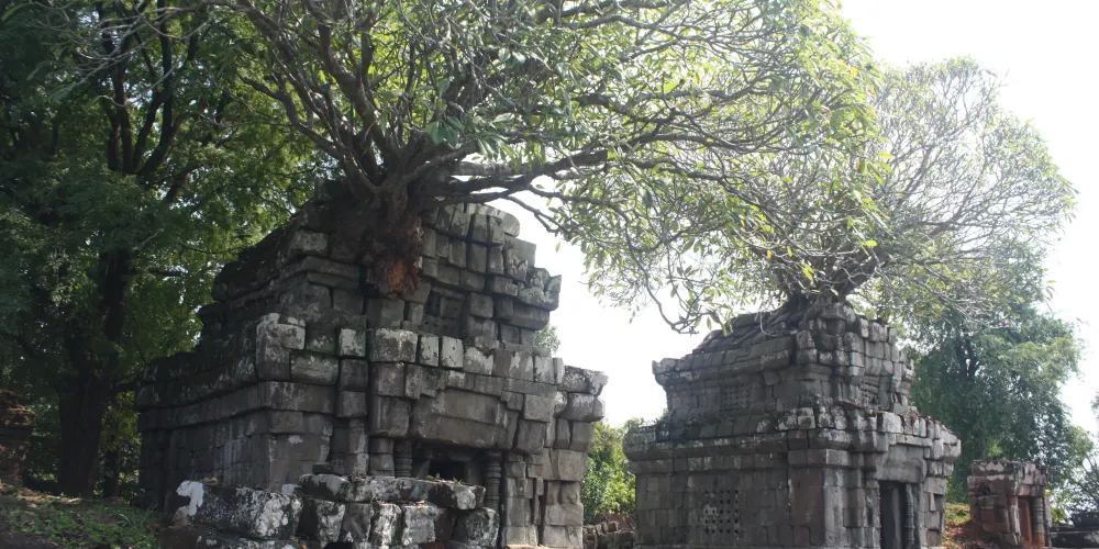上到頂層台階,近距離觀察這五座蓮花塔。塔身多有損毀,而其他建築也大都倒塌,只剩石雕的門框和廊柱在勉強支撐。在中央塔樓的東、西、南面門楣上可以看到雕刻精美的守護神,分別是因陀羅、梵倫那、閻摩。其它四座塔樓同樣有著漂亮的門楣雕刻,很有觀賞性。