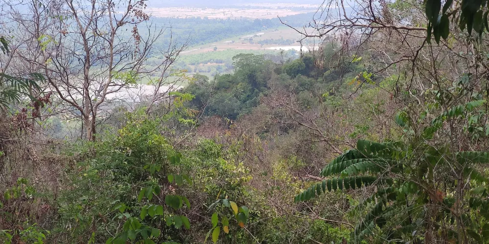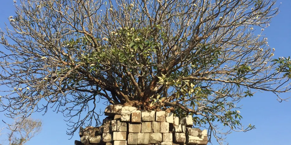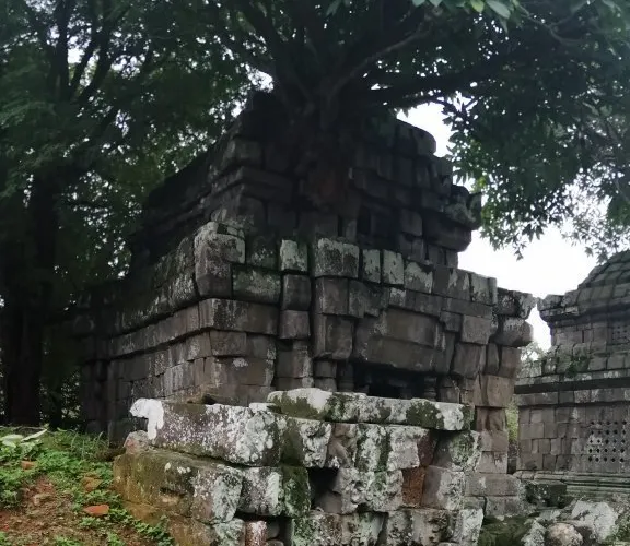 高出地面數米的東梅奔,會給人一種寺廟山的錯覺。紅色砂岩砌成的三層台階之上便是五座蓮花塔,外圍還有三層磚牆環繞。寺廟入口的拱門兩邊端坐著一對石獅子,內牆周圍有幾間廊廳,如今只剩下一些斷壁殘垣。