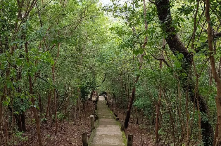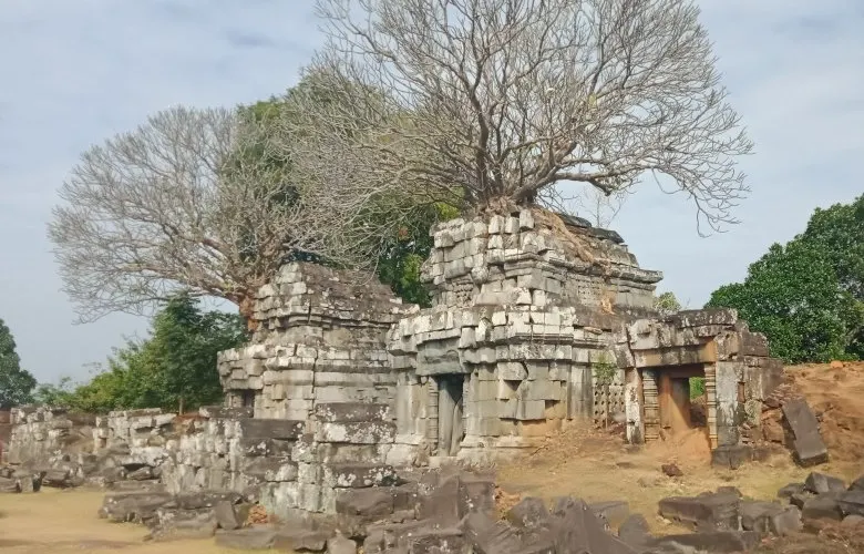 東梅奔寺所在的東池原本是一座巨大的水庫,是當時最為重要的公共建設工程,水庫四角都立有石碑。據說一千多年前必須乘船才能到達寺廟,時過境遷,這裡已變成一塊乾旱的陸地。古迹被水浸泡過的部分有所變色,但仍然可以想象到曾經這座寺廟聳立在湖中心的輝煌場景。