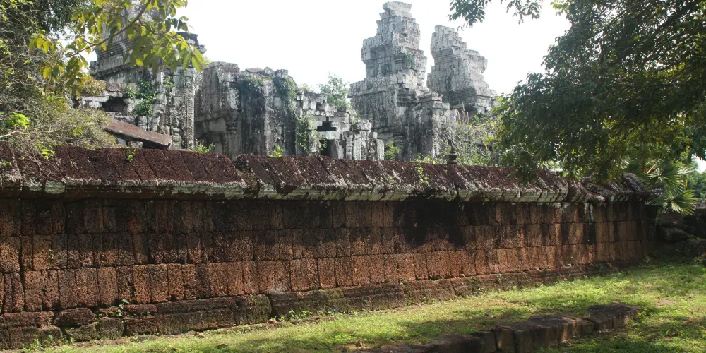 東梅奔寺位於通王城以東,是東池(即東巴萊湖)中央的一座印度教寺廟,它像是縮小版的比粒寺,有三層台階,上面按梅花狀排列著五座寶塔。不過如今東池已經乾涸,因此寺台顯得特別高。