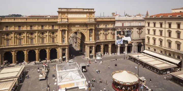 佛羅倫斯的共和廣場是義大利佛羅倫斯市中心的重要歷史廣場,以其優雅的建築、豐富的文化底蘊和充滿活力的現代氛圍而聞名。 19世紀末,佛羅倫薩成為意大利王國的臨時首都,在此期間,廣場經歷了大規模的城市改造,形成了今天的新古典主義風格,並更名為“共和廣場”,以紀念意大利的統一和共和精神。廣場的標誌性建築包括高大的勝利拱門,上面刻有「古老的城市中心從百年荒蕪中重獲新生」的銘文,象徵佛羅倫薩的城市復興。廣場周圍環繞著精美的拱廊建築,其中有名的是Gilli咖啡館,自開業以來,一直是藝術家、作家和知識分子的聚集地。此外,廣場上還有豐裕之柱,這是一根古老的石柱,歷史上曾是佛羅倫斯城市邊界的象徵。共和廣場不僅是佛羅倫斯的地理中心,更是文化、歷史與現代生活交會的象徵,吸引無數遊客前來感受這座城市的獨特魅力。