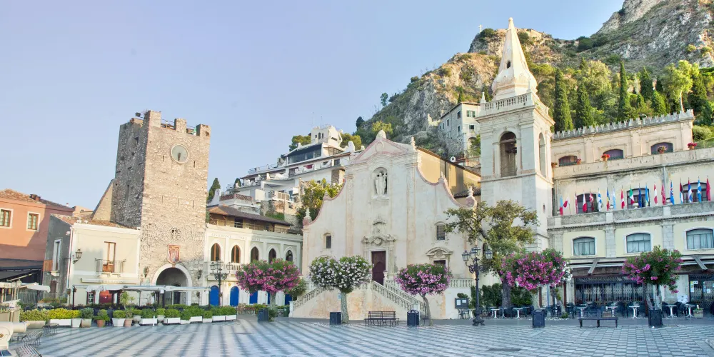 四月九日廣場是一個具有典型西西里島風格的廣場,獨具特色的黑白地磚。天氣好的時候,可以眺望遠處可見的愛奧尼亞海和埃特納火山。而在廣場另一邊則是前哥特風的聖奧古斯丁教堂和17世紀的聖約瑟夫教堂。