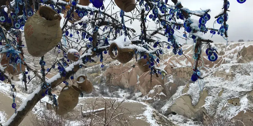 除了可愛的鴿子,附近還有一棵掛滿土耳其傳統附身符“藍眼睛”的樹,很有趣。此外,鴿子谷內也有很多石洞房間和通道可以探索,有點類似烏奇薩要塞,只是台階較少,攀登時依然需要注意安全。
