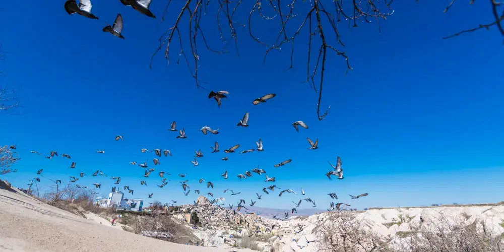 鴿子谷靠近烏奇薩(Üçhisar),因沿途彩色的鴿舍而得名。這個山谷裡到處都是石頭,石頭上有許多密密麻麻的洞眼,走到跟前才會發現原來都是鴿子洞。若在傍晚時來此,有機會看到鴿子回巢的壯觀場面。