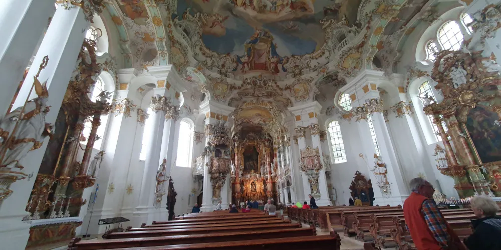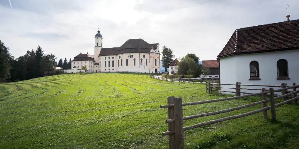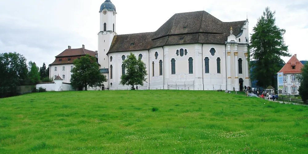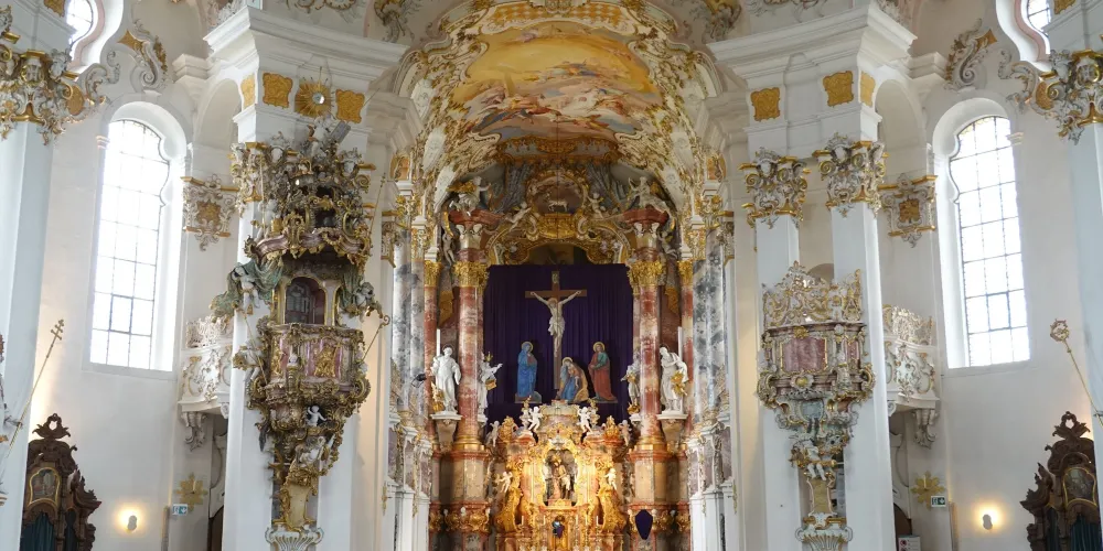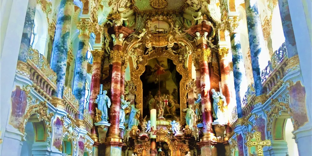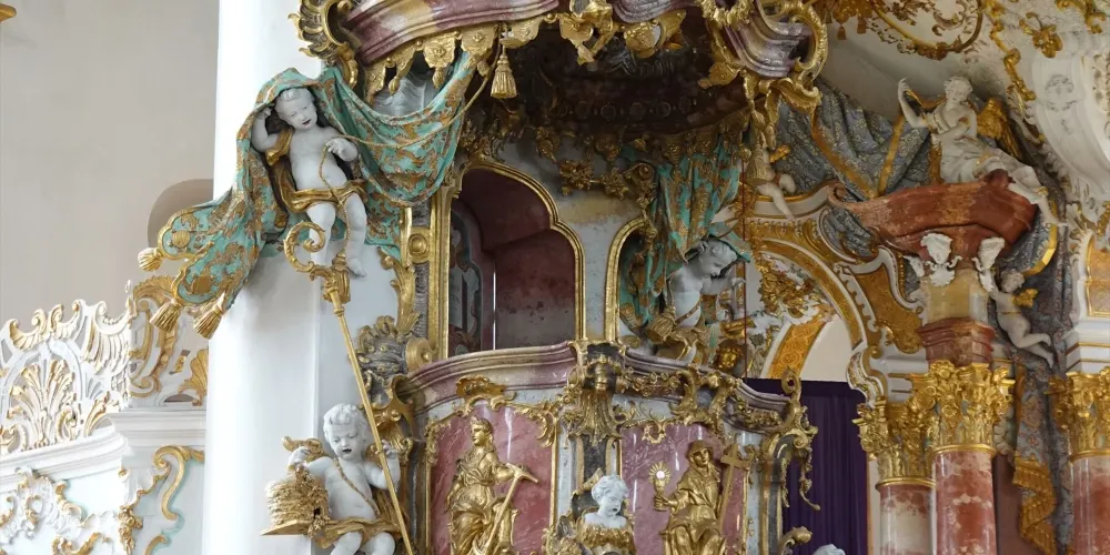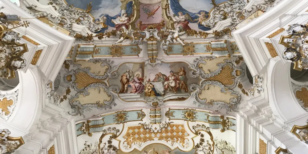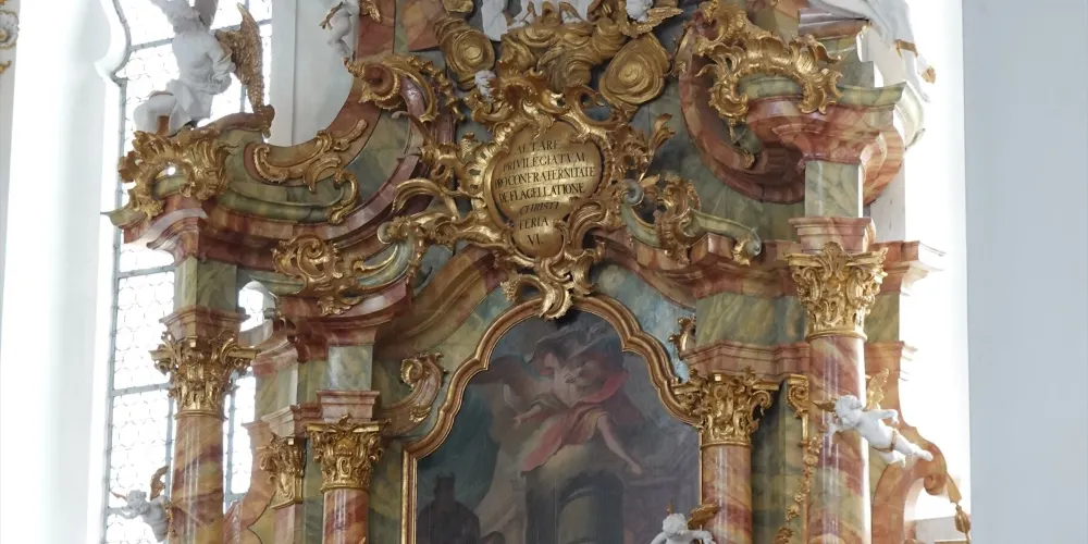 位於施泰因加登(Steingaden)威斯區(Wies)的朝聖教堂“受鞭打的救世主”是世界最著名的洛可可式教堂之一。這座教堂的中心是受難的基督耶穌——受鞭打的救世主形象。1738 年6月14日,名叫瑪利亞·羅瑞(Maria Lory)的農婦看到刑柱上受難耶穌的眼中淌著淚水。這一奇觀隨即引發了人們前往 “受鞭打的救世主”教堂朝聖的風潮。為此,1745至1754年多米尼庫斯·齊默爾曼(Dominikus Zimmermann)建造完成了這座獨一無二的教堂。教堂裝飾幾乎完全採用了洛可可藝術風格。每年大約有一百萬遊客從世界各地前來參觀,其中也包括許多朝聖者。