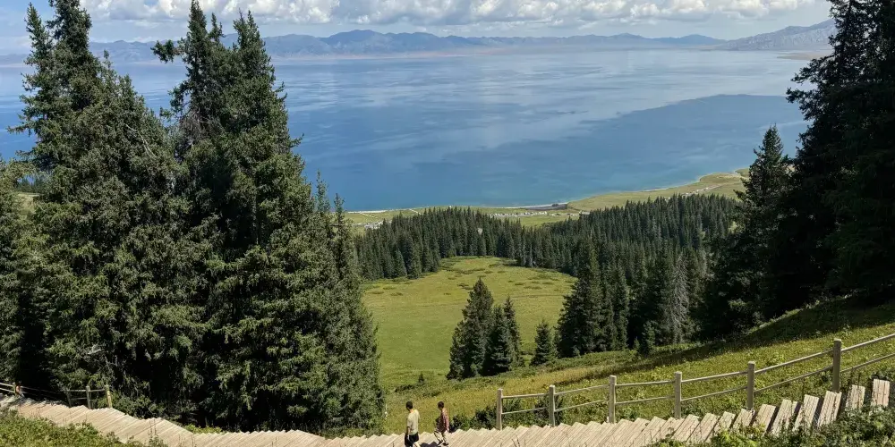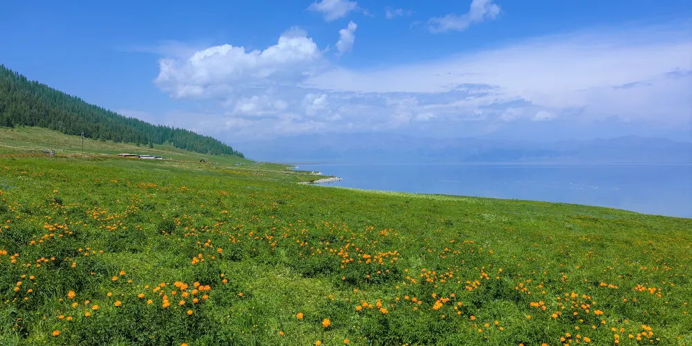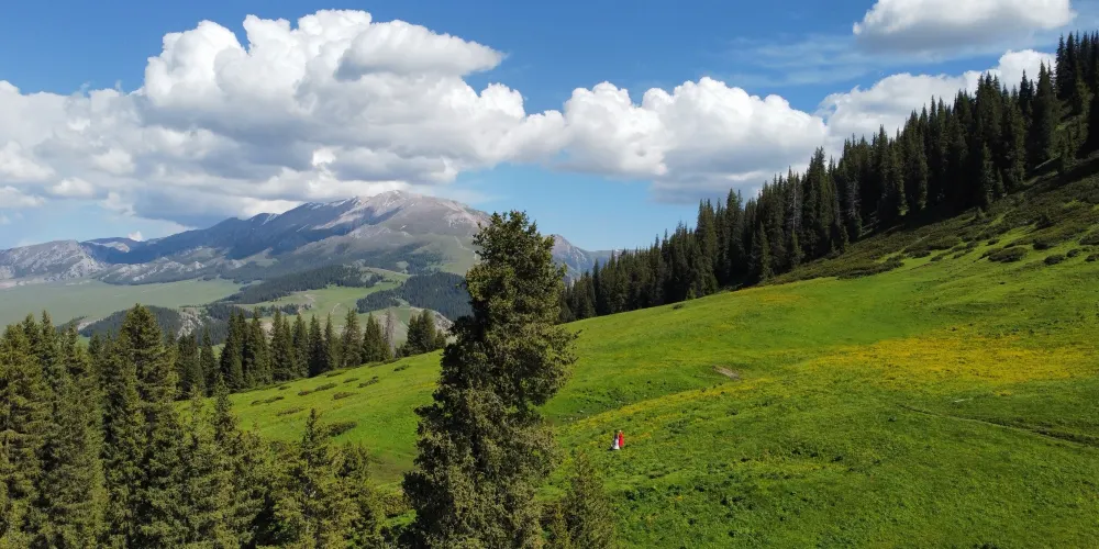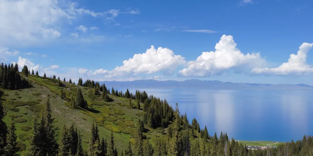 松樹頭位於賽里木湖南岸,海拔約2073米,因山頂松林密布而得名。登頂後,視野豁然開朗,近處是湖畔金黃花海與青翠草甸,遠處湛藍湖水與天際線交融,更遠處則可見天山雪峰連綿如屏,形成「湖水—草原—森林—雪山」的立體畫卷。若天氣晴好,還能清晰眺望果子溝大橋如龍橫跨峽谷的震撼景象,自然與人工的壯麗在此交會。